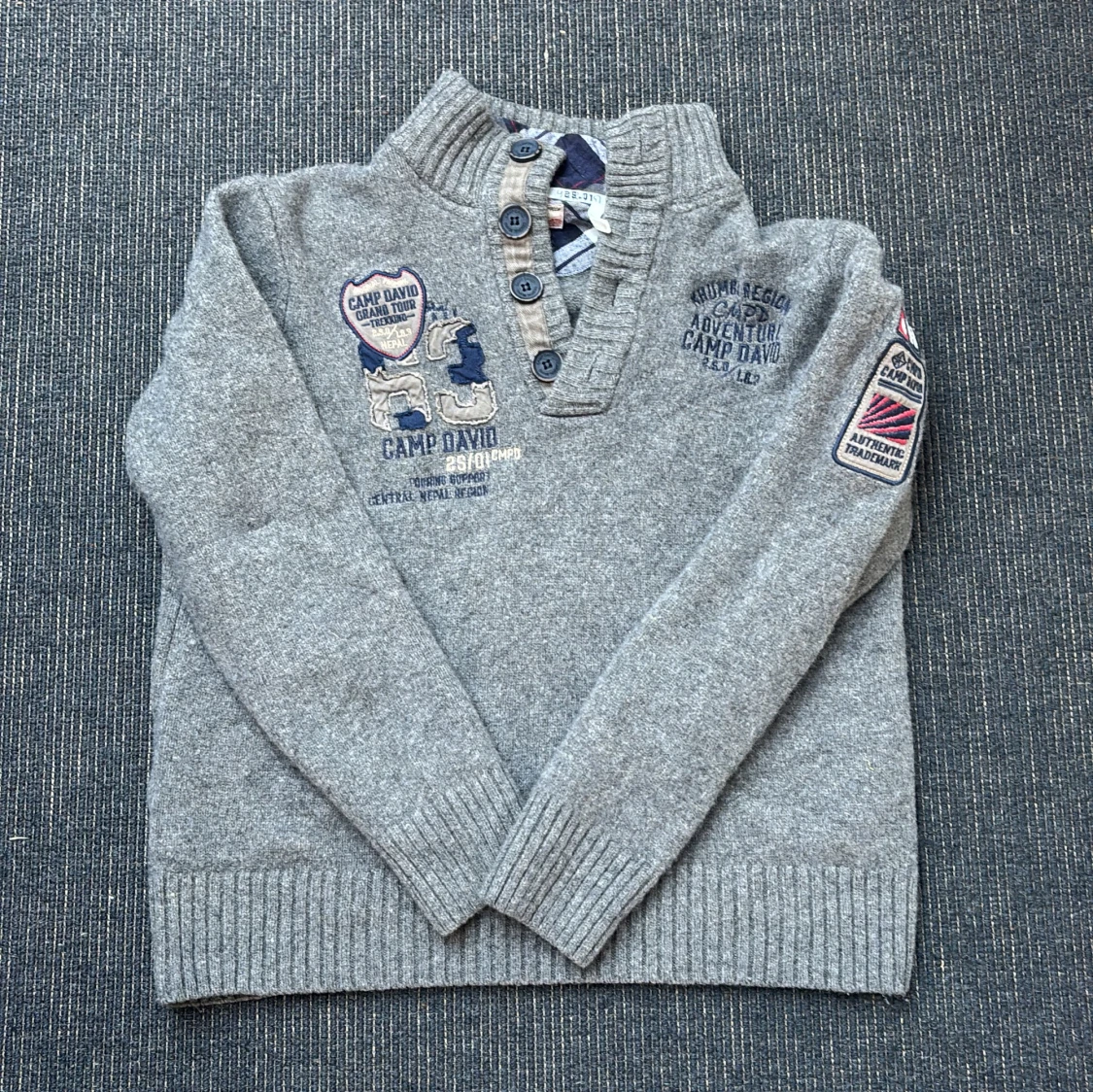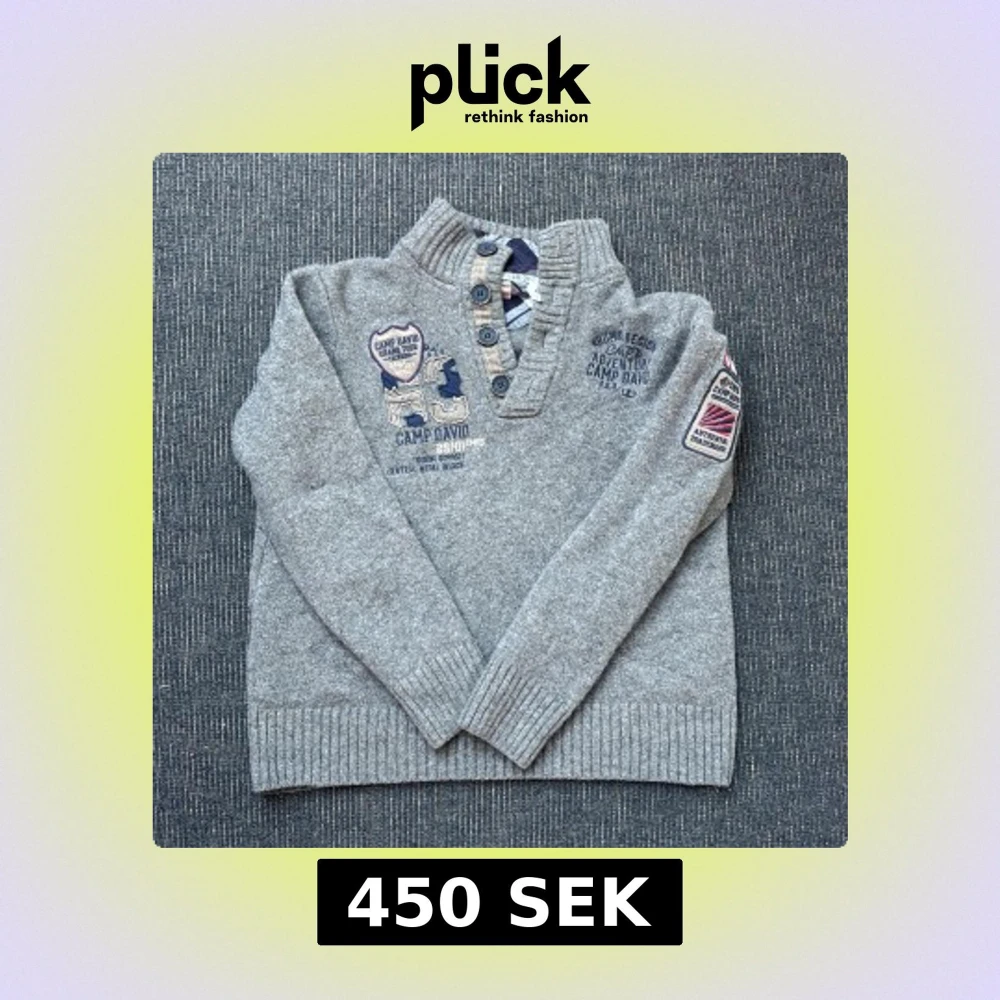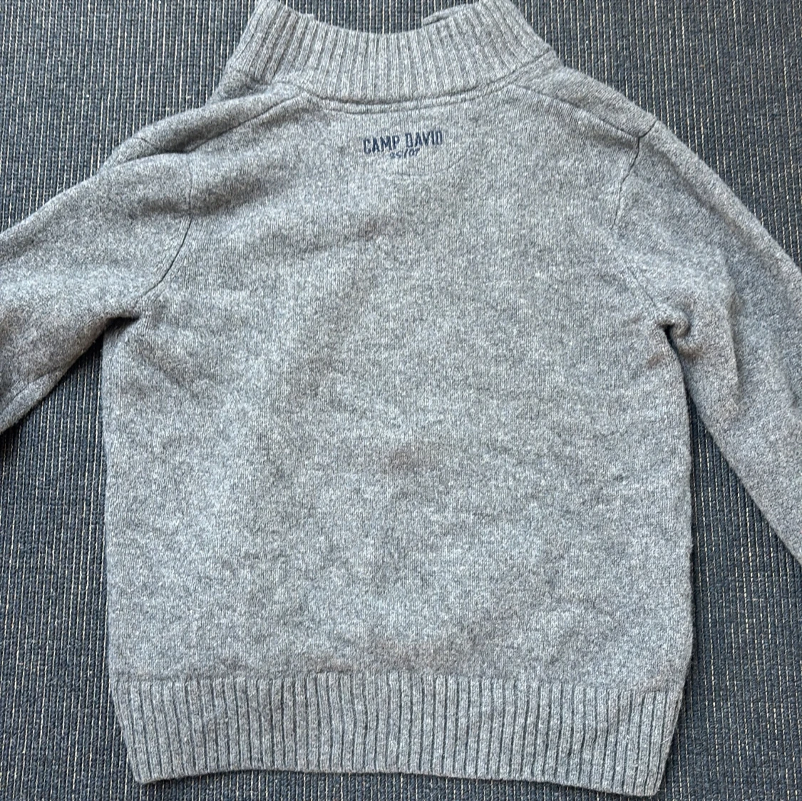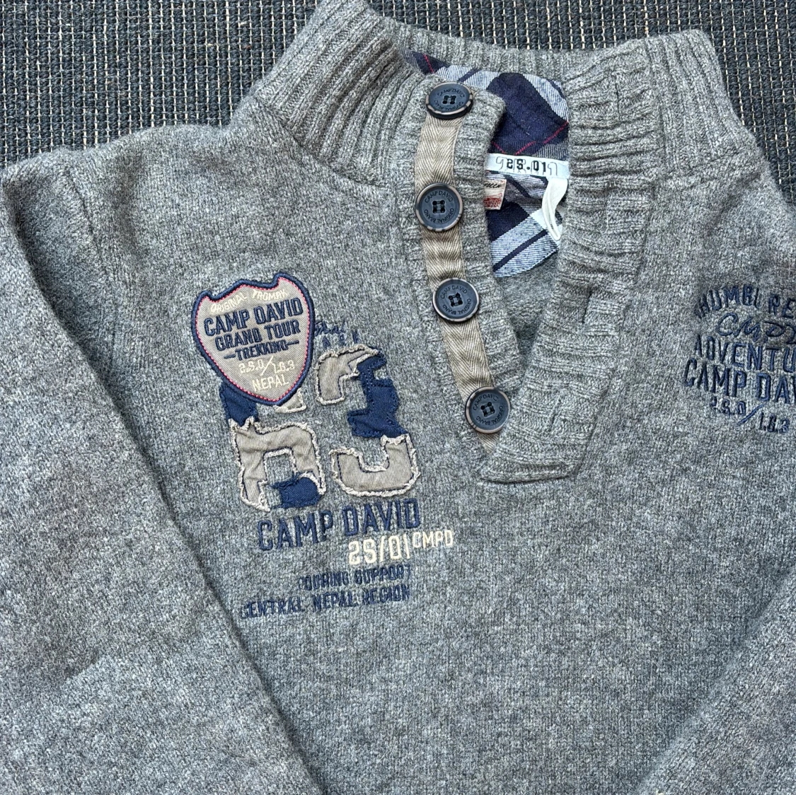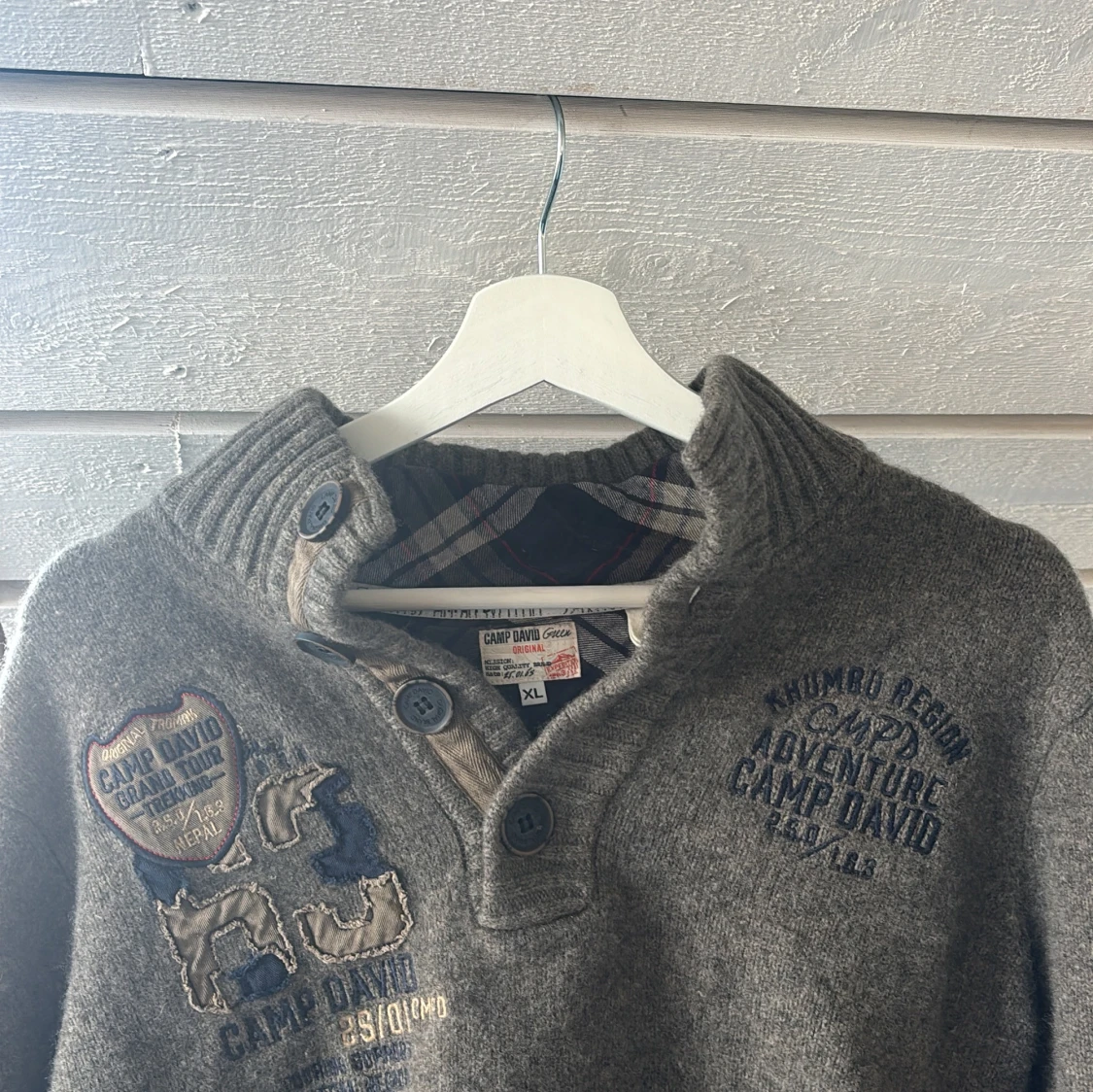 Säljer en snygg grå vintage tröja från Camp David med broderade detaljer och knappar framtill. Tröjan har en hög krage och långa ärmar, perfekt för kyligare dagar. Den är ribbad vid ärmslut och nederkant för en bekväm passform. Perfekt för skola osv. Storlek XL men sitter som L.