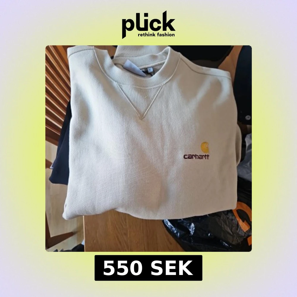 Säljer en stilren beige sweatshirt från Carhartt med broderad logga i rött och gult på bröstet. Tröjan har en klassisk rund hals och ribbade muddar vid ärmslut och nederkant. Perfekt för en avslappnad stil.