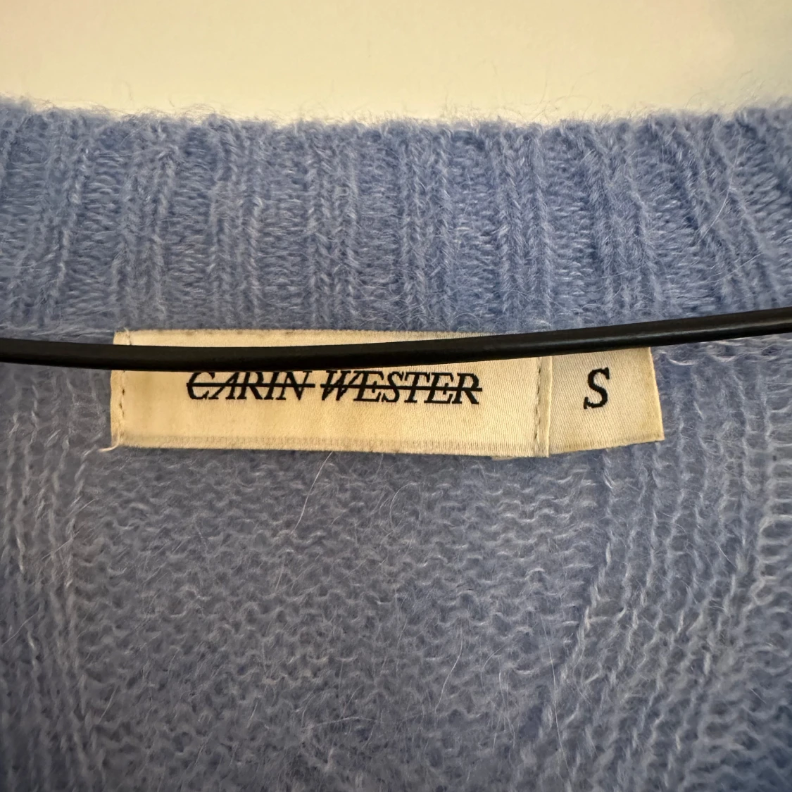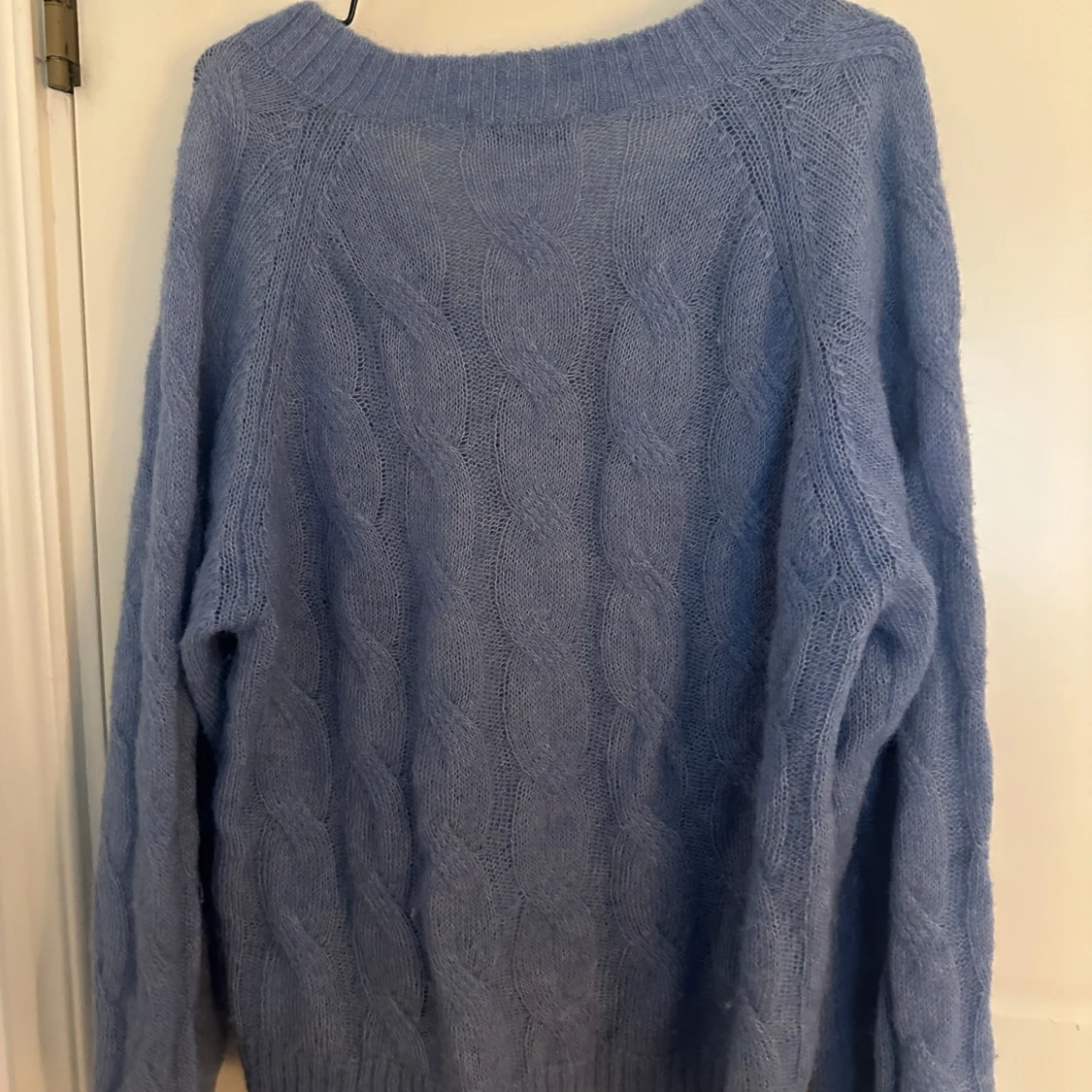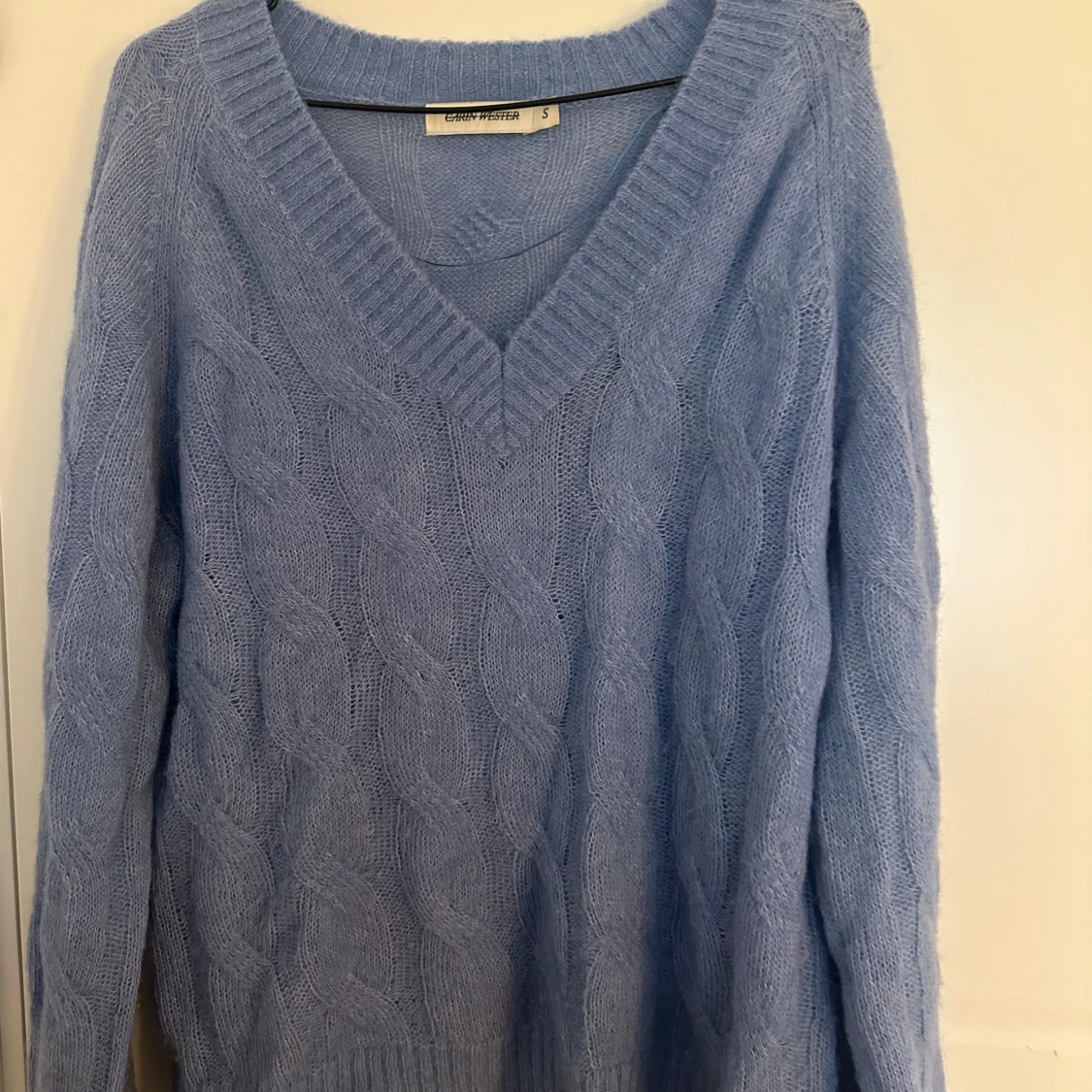 Superfin ljusblå stickad tröja från Carin Wester med grovt kabelstickat mönster och djup v-ringning.