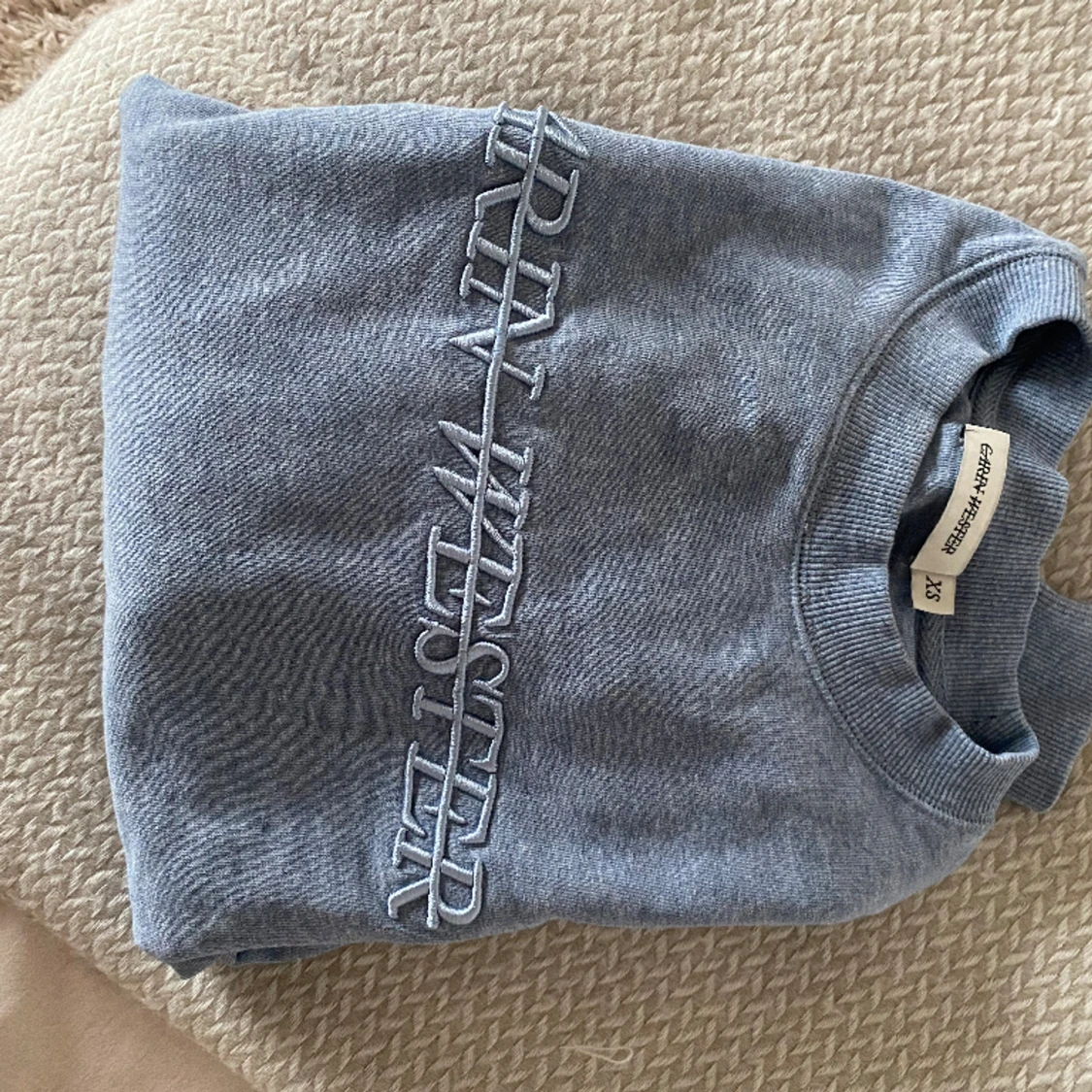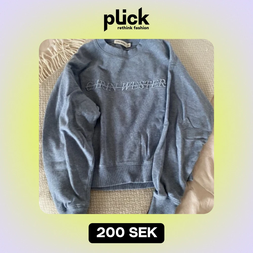 En fin baby blå sweatshirt från Carin Wester. Den är lite oversize, eller om man tänker att den är en xs så är den alltså lite stor i storleken. Passar S och kanske till och med M. (Ingen aning). Nypris 429kr.