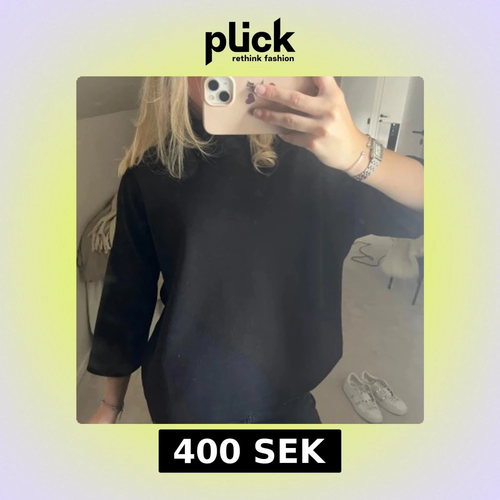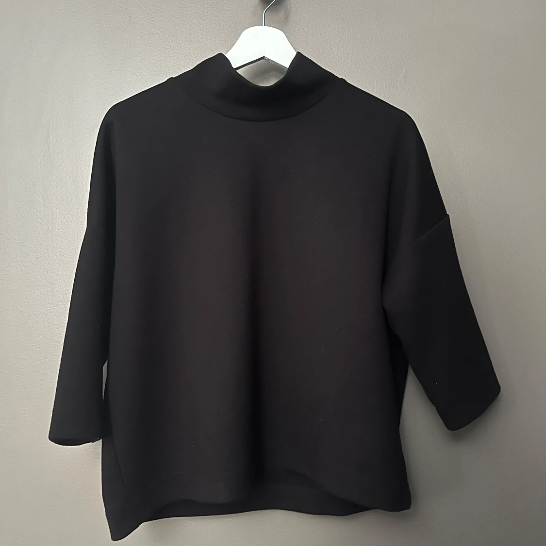En svart polotröja med hög krage och trekvartsärmar. Tröjan har en loose passform och är enkel och stilren, perfekt att matcha med jeans eller kjol. Materialet känns mjukt och bekvämt mot huden.