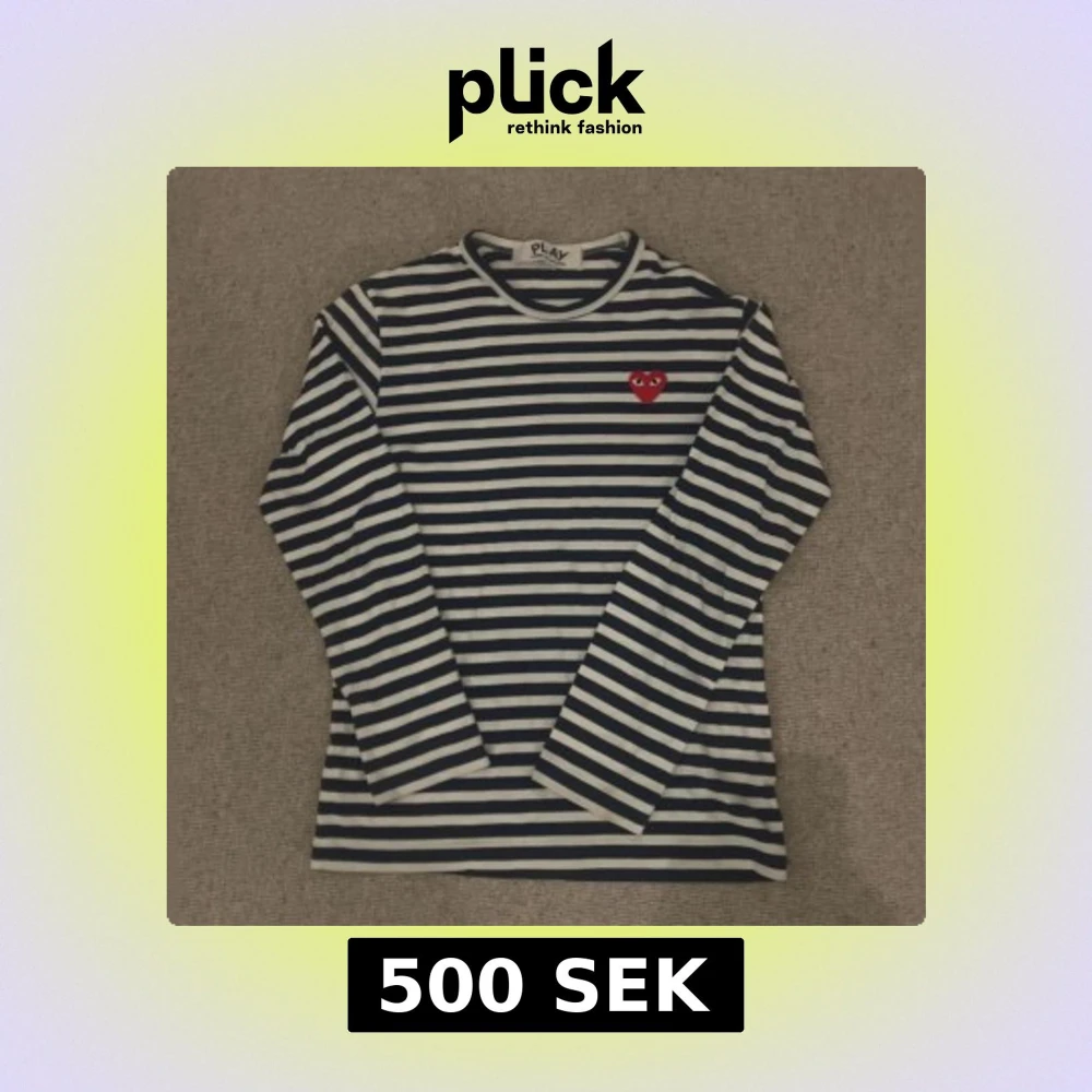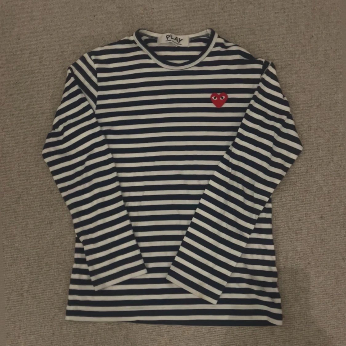 Säljer en klassisk långärmad tröja från Comme des Garçons Play med marinblå och vita ränder. Tröjan har ett rött hjärta med ögon broderat på bröstet. Perfekt för en stilren och trendig look.