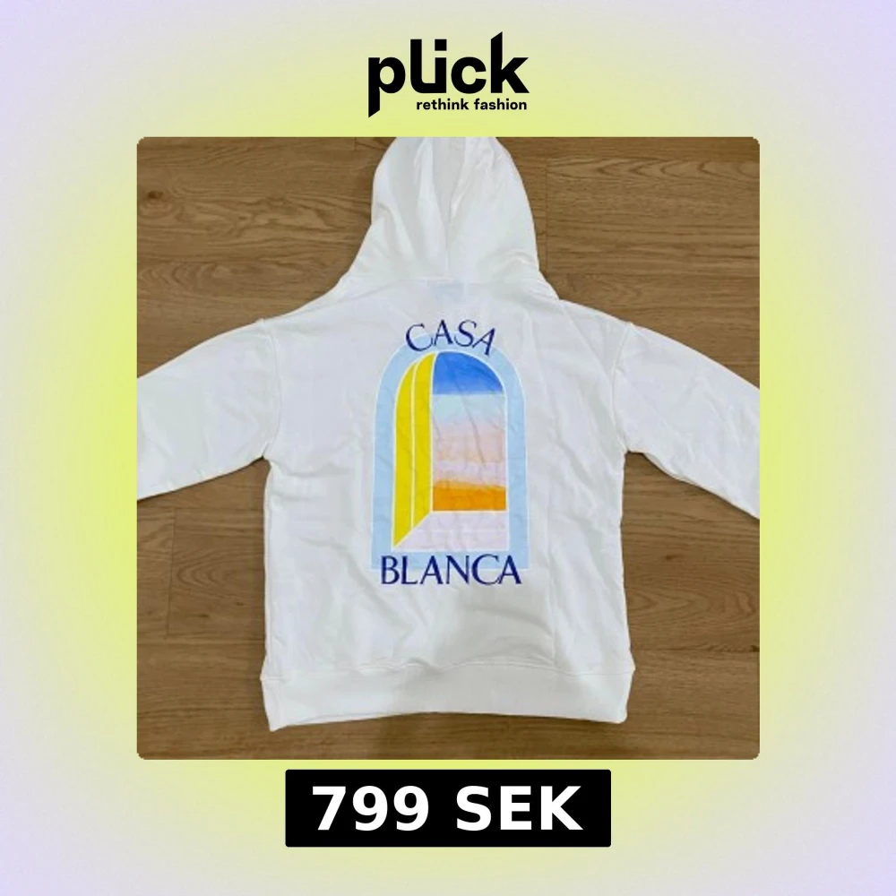 Vit hoodie från Casablanca med färgglad grafisk print på både bröstet och ryggen. Trycket har blå, gul och orange toner och texten 'Casa Blanca'. Hoodien har huva och känguruficka framtill. Perfekt för en chill och stilren look.