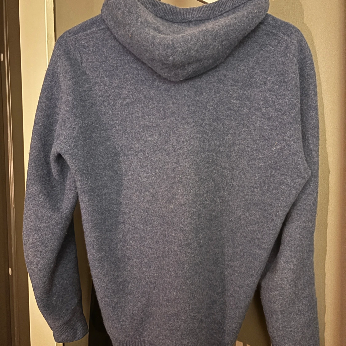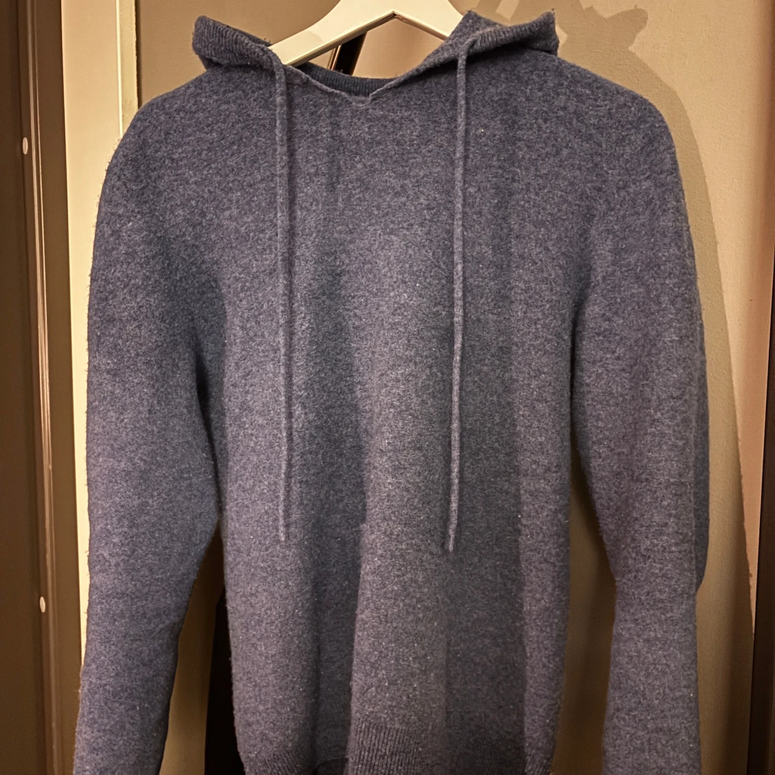 Säljer en stilren blå hoodie med långa ärmar och justerbar huva. Perfekt för kyliga dagar och ger en avslappnad look. Passar bra till jeans eller joggers. Storlek xs/s