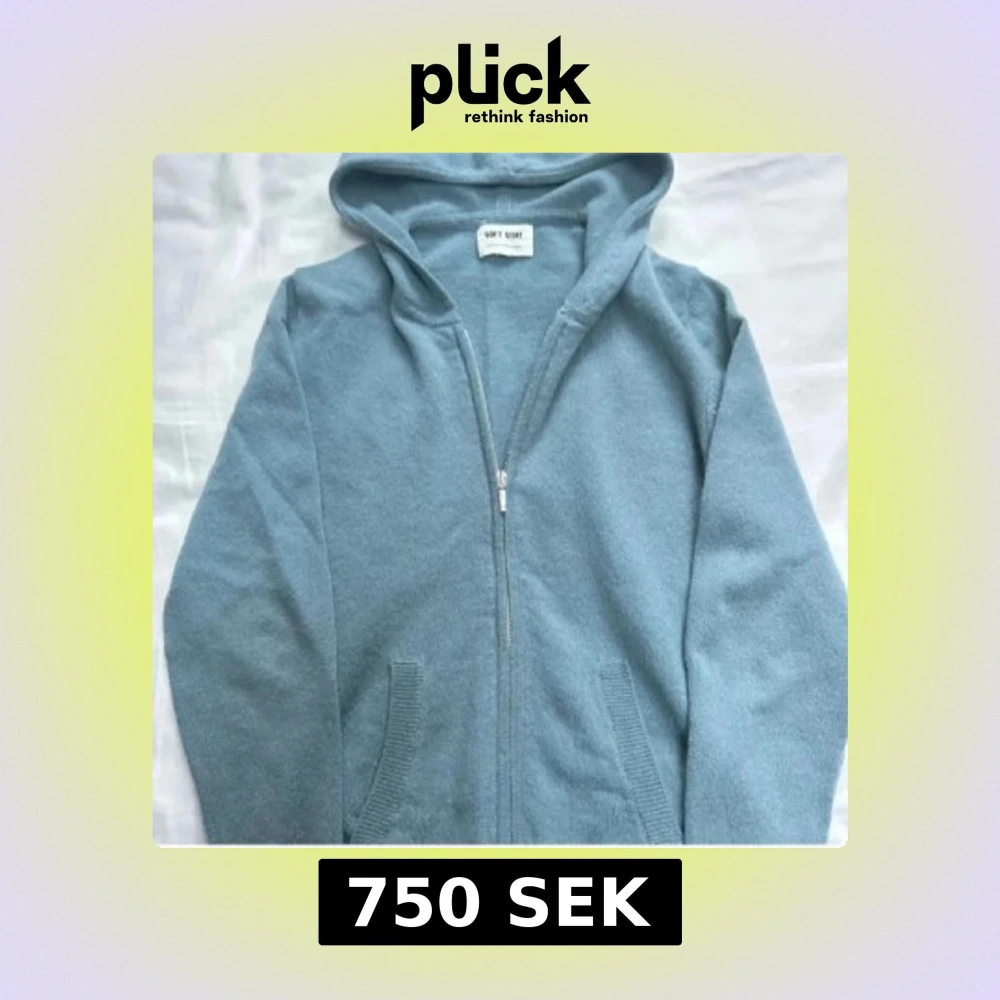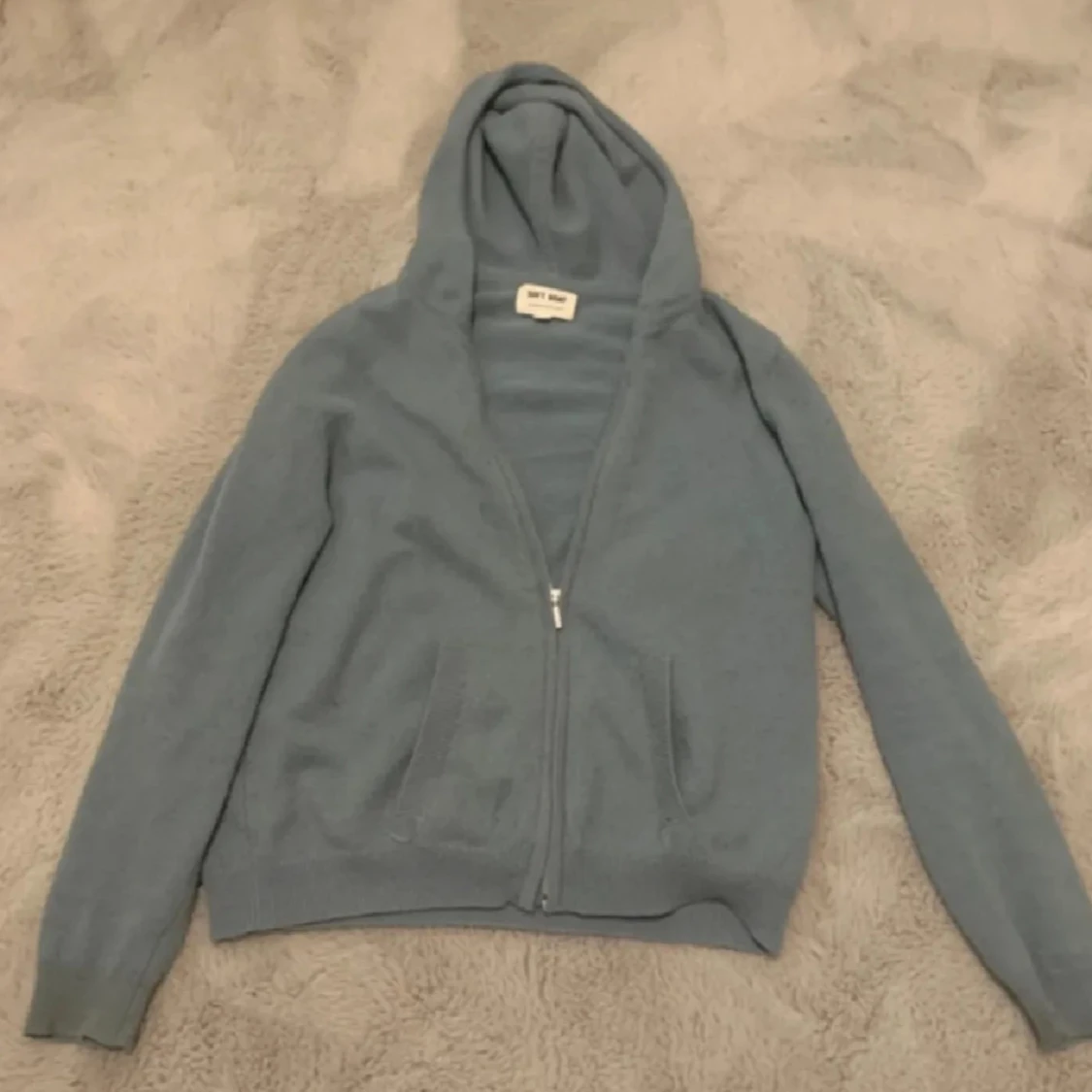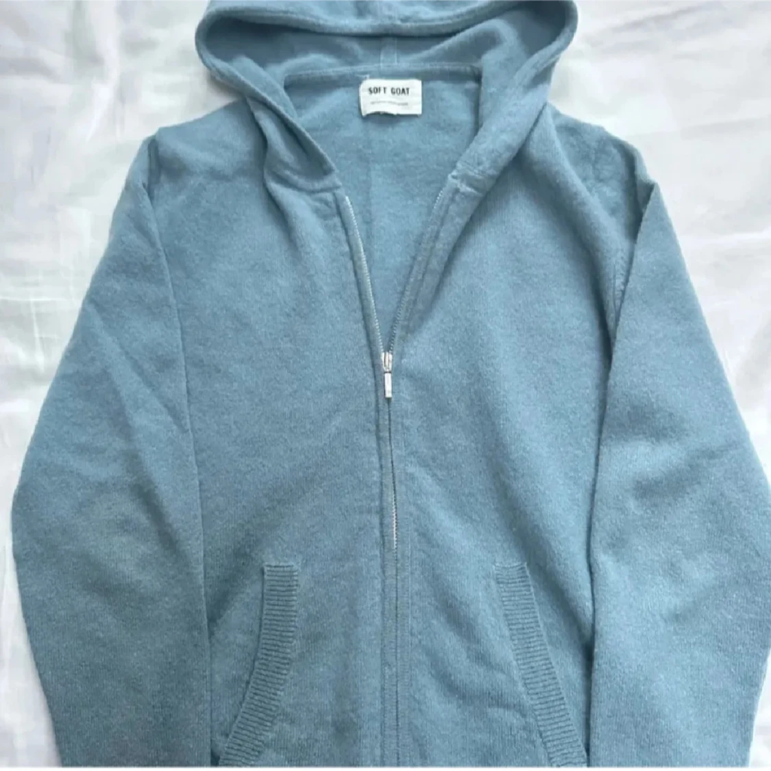Mysig ljusblå hoodie från Soft Goat i mjukt material. Tröjan har dragkedja framtill, två fickor och långa ärmar. Storlek 170, nypris 2000kr i 100% cashmere.