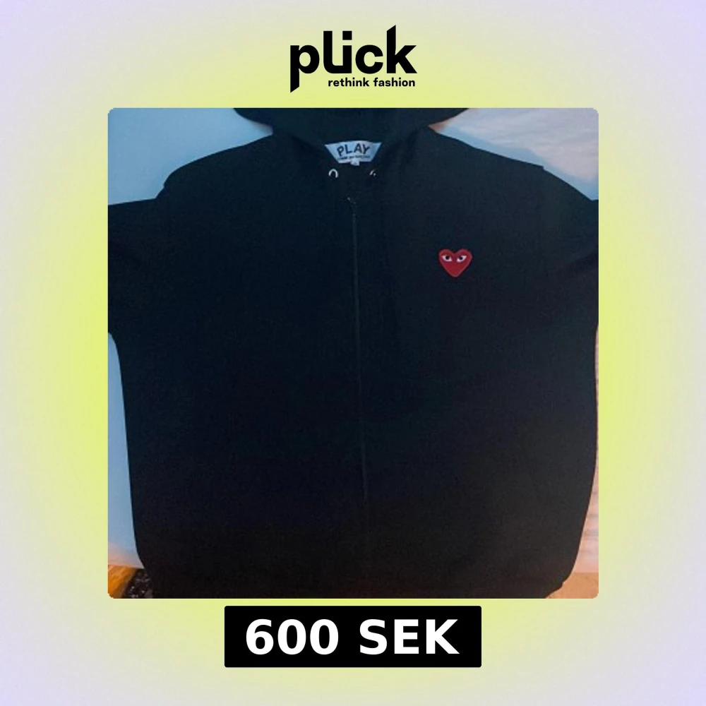 Säljer en stilren svart hoodie från Comme des Garçons med det ikoniska röda hjärtat med ögon på bröstet. Hoodien har dragkedja och en bekväm passform. Perfekt för en casual look.