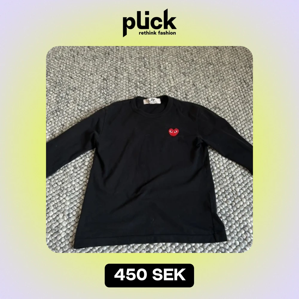 Tjena, säljer denna snygga CDG tröja, använd ganska mycket men är fortfarande i ett väldigt bra skick, tröjan är hel och ren och är perfekt nu till sommaren då den är lite tunnare, mer som T shirt material. Hör av er vid frågor eller funderingar!