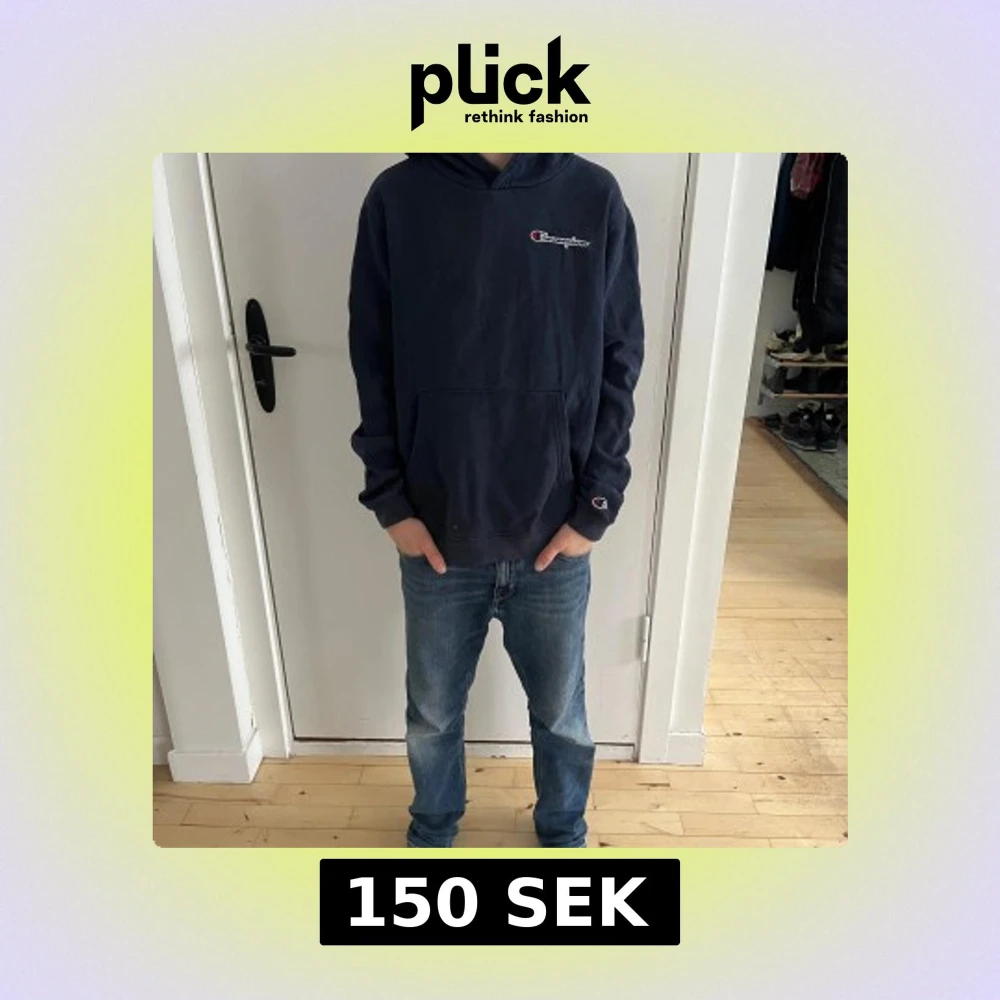 Säljer en marinblå Champion huvtröja i storlek 174–179 cm (15–16 år). Tröjan har en justerbar huva, känguruficka och Champion-logga på bröstet och ärmen. Materialet är mjukt och bekvämt, perfekt för vardagsbruk. Skick: Bra begagnat skick, med minimalt slitage. Nypris: 600 SEK