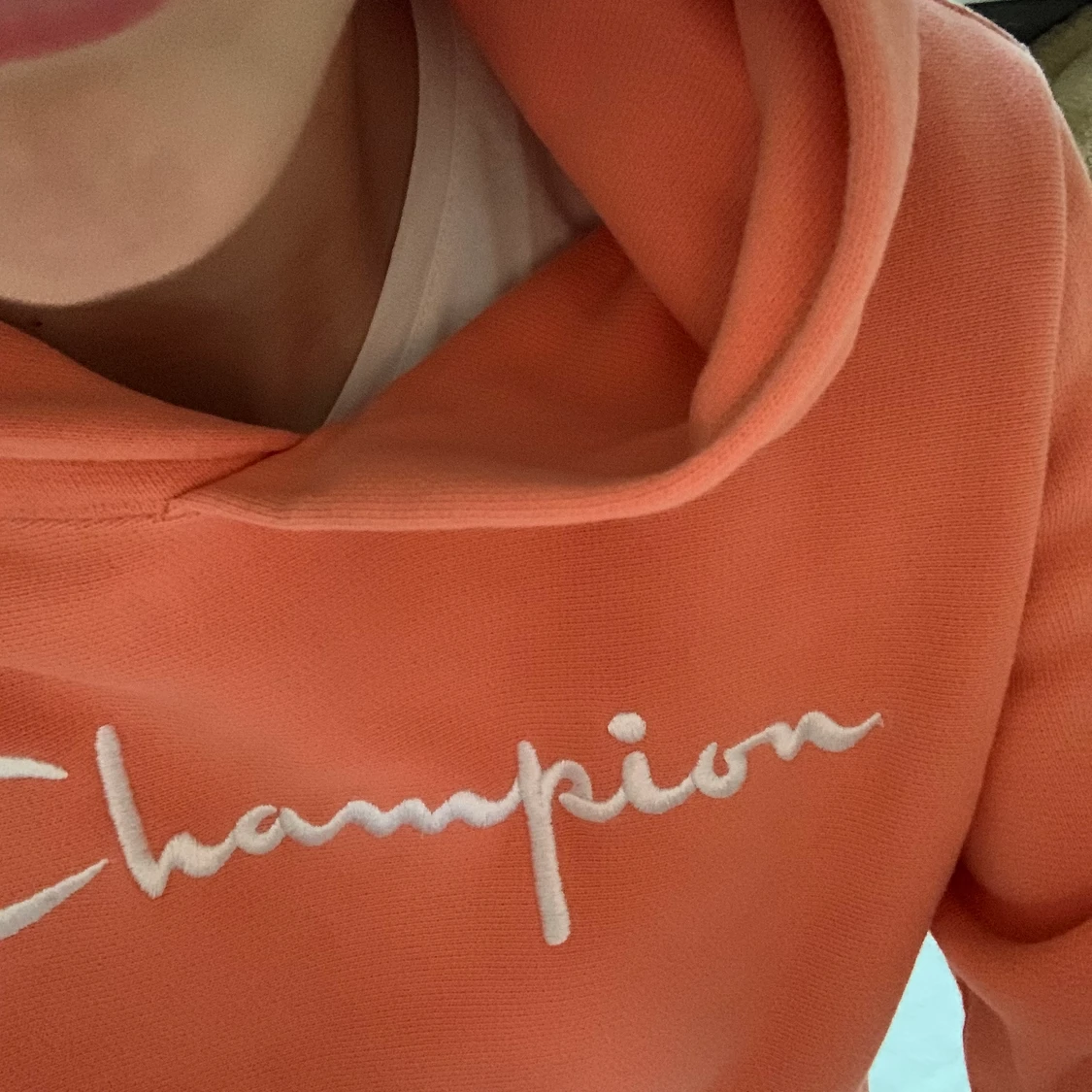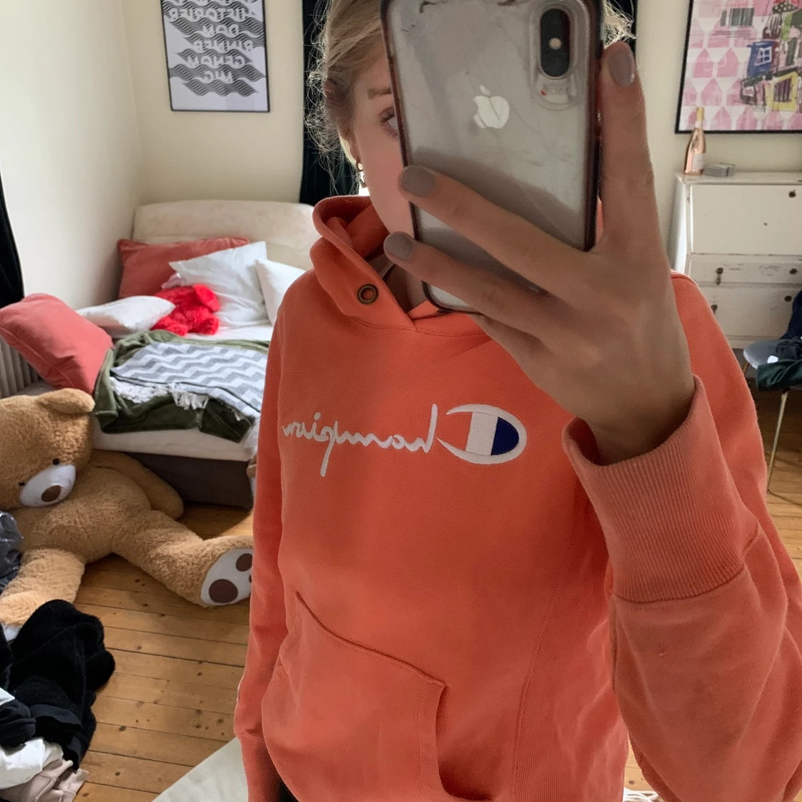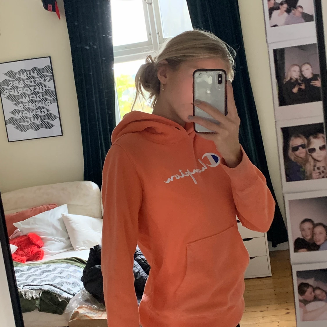 En hoodie ifrån champion i tjockt och bra kvalitets material. Inte mycket andvänd. En orange/Peache färg💗 Unik och cool