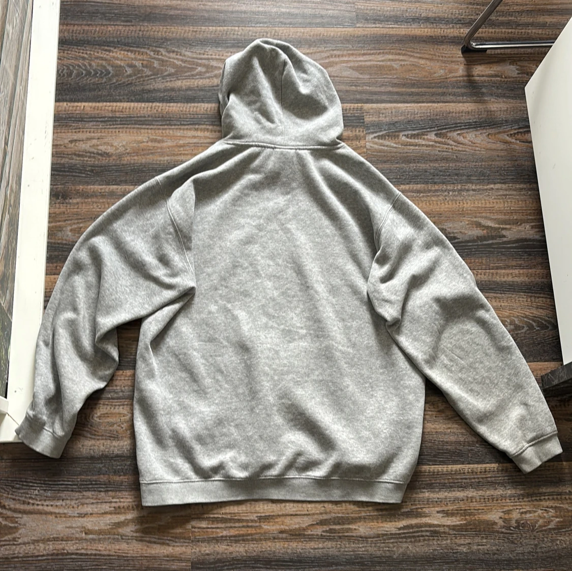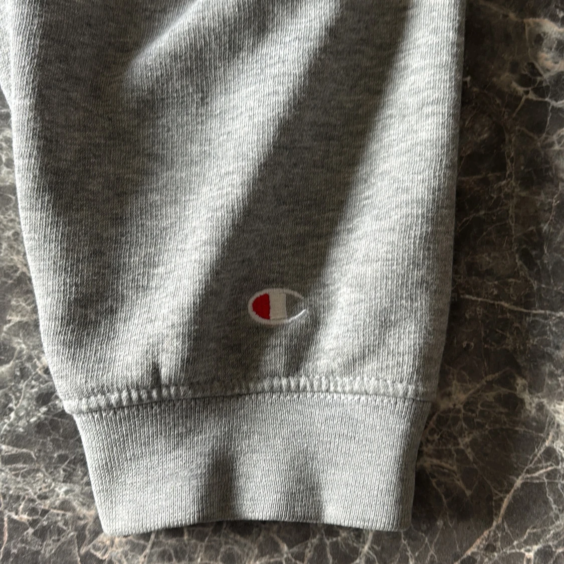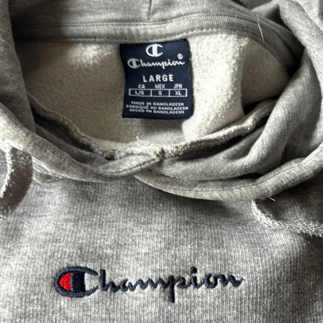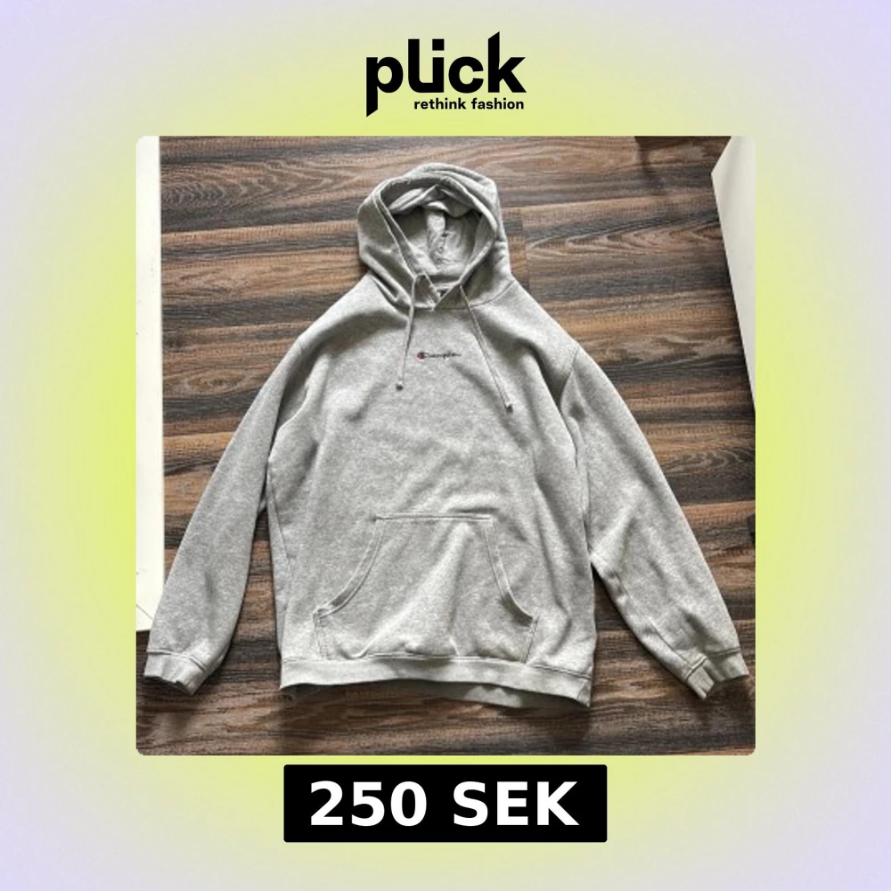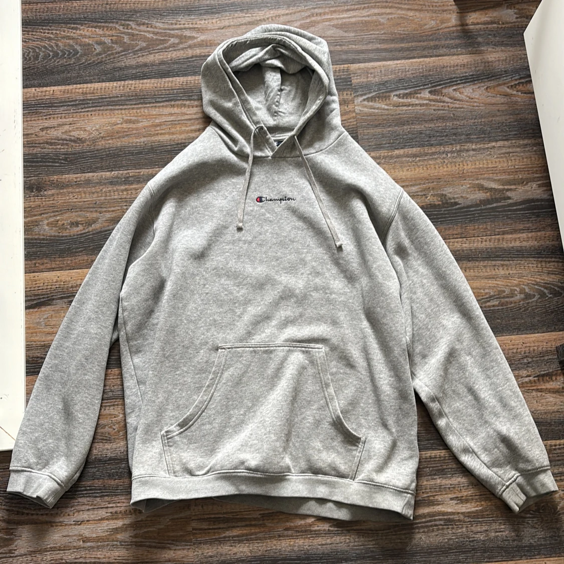 Säljer en klassisk grå hoodie från Champion med broderad logga på bröstet och ärmen. Tröjan har en stor ficka framtill och justerbar huva med dragsko. Perfekt för en avslappnad stil.