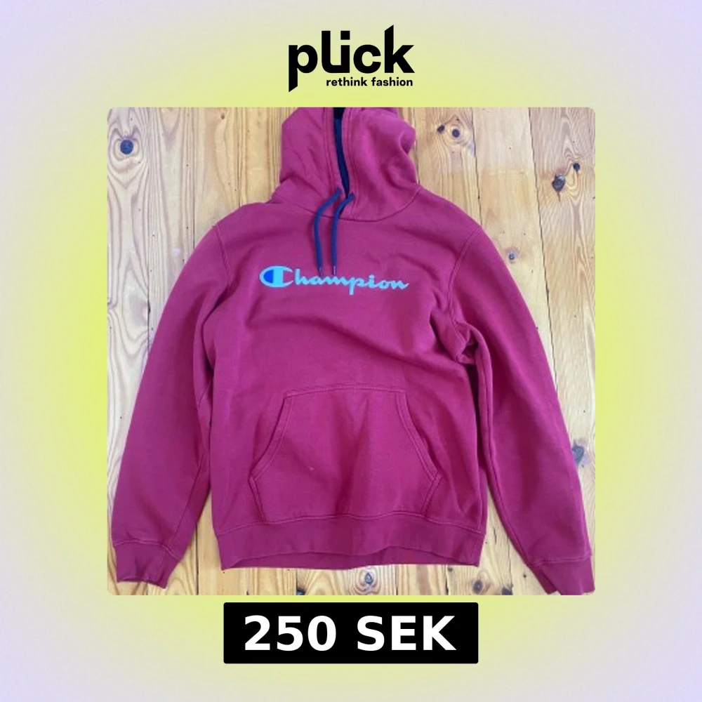 Säljer en röd hoodie från Champion med stor logga på bröstet. Tröjan har huva med blå snören och en klassisk magficka. Perfekt för chill dagar och streetwear-stil. Materialet är mjuk bomull och modellen är normal i passningen.