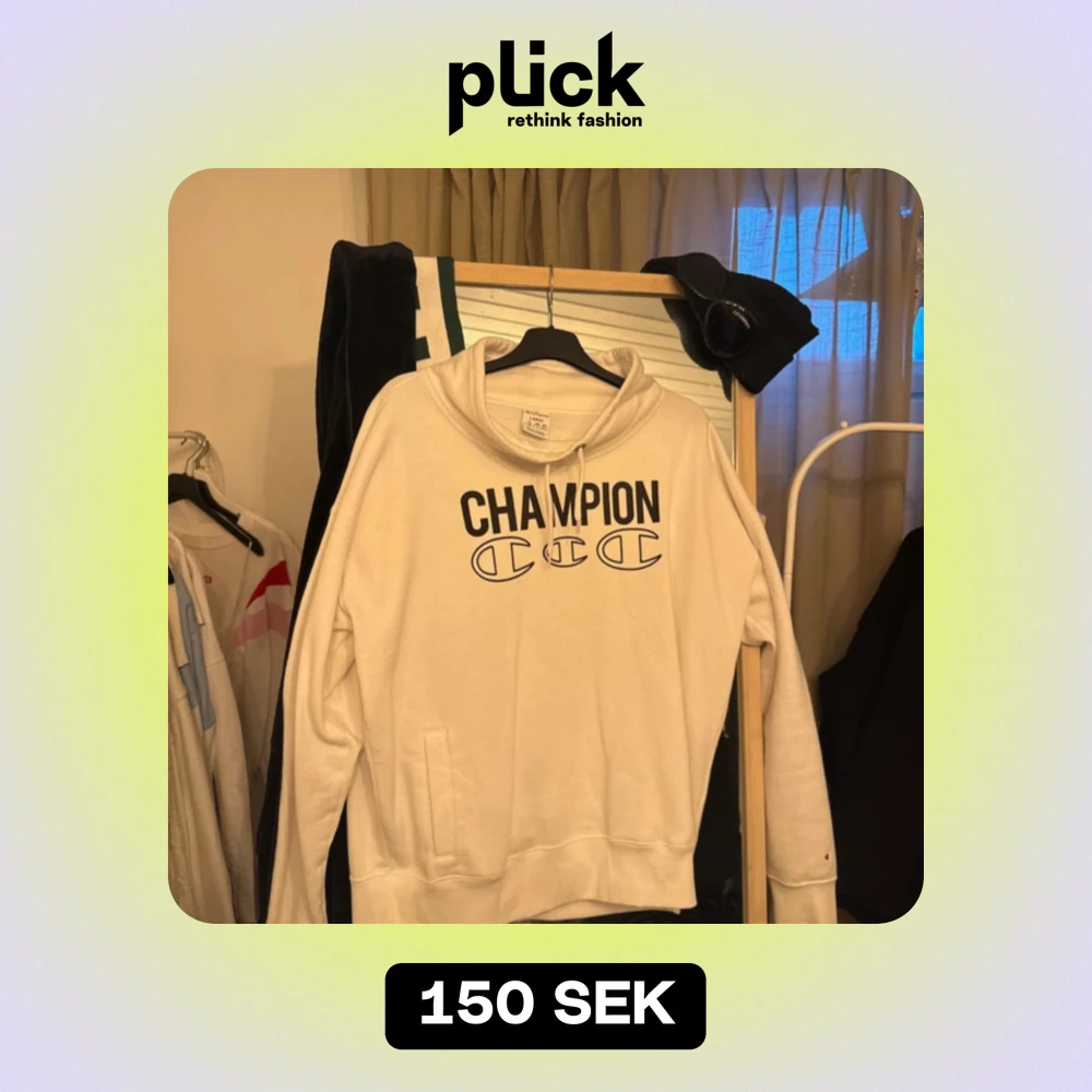 Säljer en vit hoodie från Champion i storlek L. Den har en stor logga på framsidan och är superbekväm med långa ärmar. Perfekt för en avslappnad stil eller kyliga dagar. 🏆