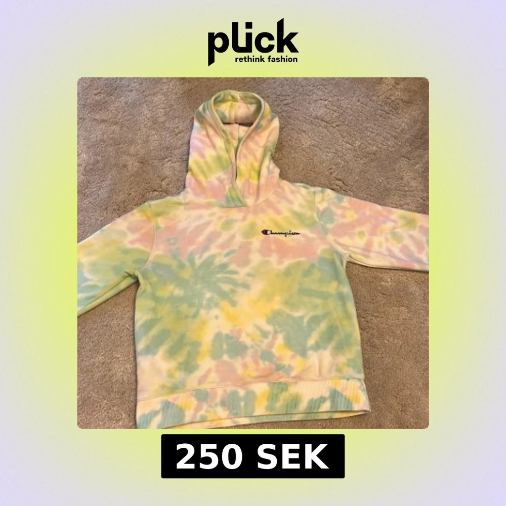 Säljer en superfin hoodie från Champion i storlek Large. Tröjan har ett färgglatt tie-dye mönster i pastellfärger som gul, grön, rosa och blå. Klassisk huva och långärmad modell, perfekt för dig som gillar en chill och färgstark stil.