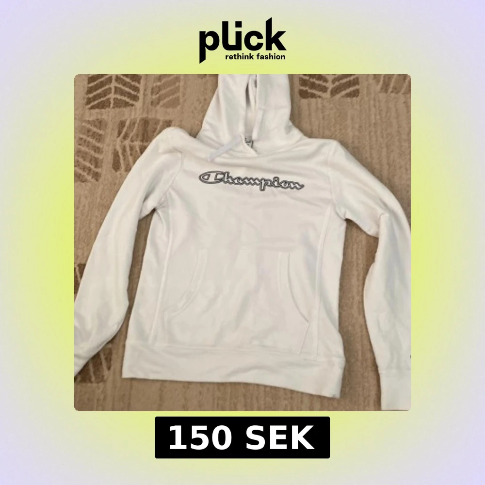 Vit hoodie från Champion med stor logga över bröstet och klassisk känguruficka. Tröjan har huva med snörning och lång ärm, samt broderad Champion-logga på ärmslutet. I storlek M men skulle säga att de är mer för personer som har S/xs