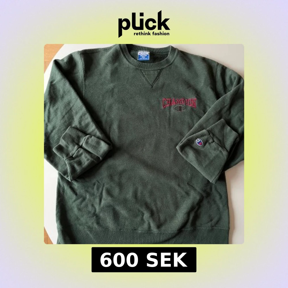 Mörkgrön sweatshirt från Champion i storlek medium. Tröjan har broderad Champion-logga i rött och grått på bröstet samt en liten logga på ärmen. Rund hals och ribbade muddar vid ärmslut och nederkant. Köpt av mig i Tokyo! Är öppen för prisförslag