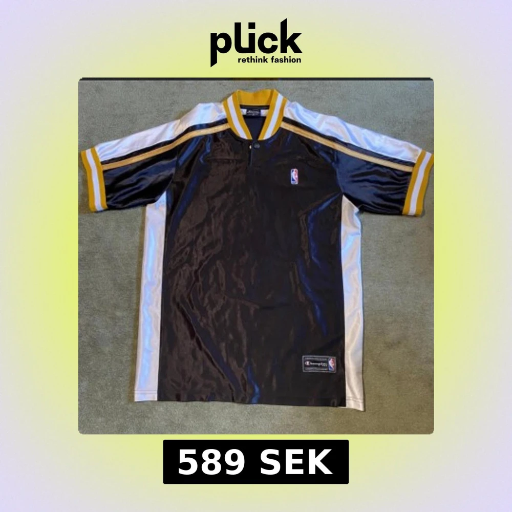 Snygg pikétröja från Champion med officiell NBA-logga. Tröjan är svart med vita och gula detaljer, har korta ärmar och ribbad krage med gula och vita ränder. Materialet är glansigt polyester och ger en sportig vibe. Perfekt för basketfans som vill sticka ut.