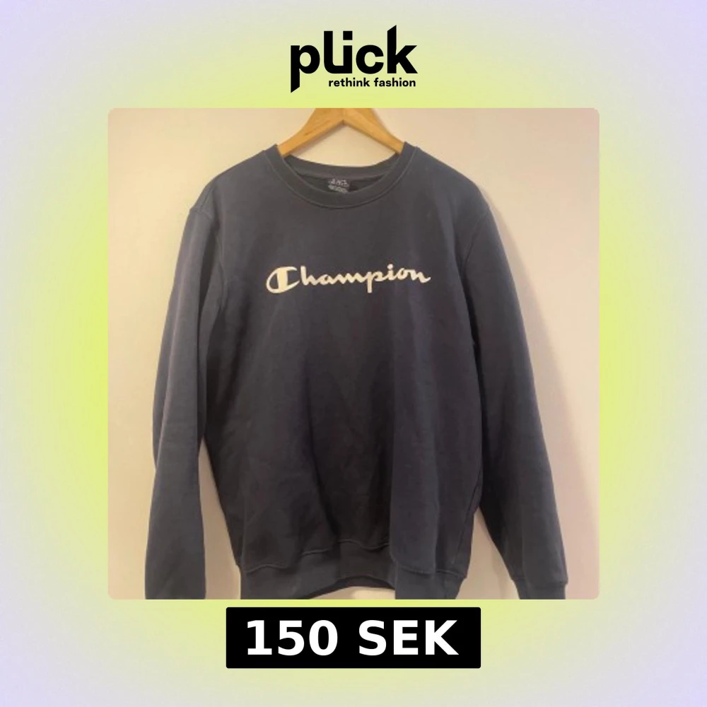 Säljer en mörkblå sweatshirt från Champion med deras ikoniska logga i vitt på bröstet. Storlek M