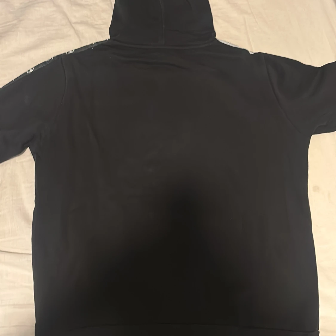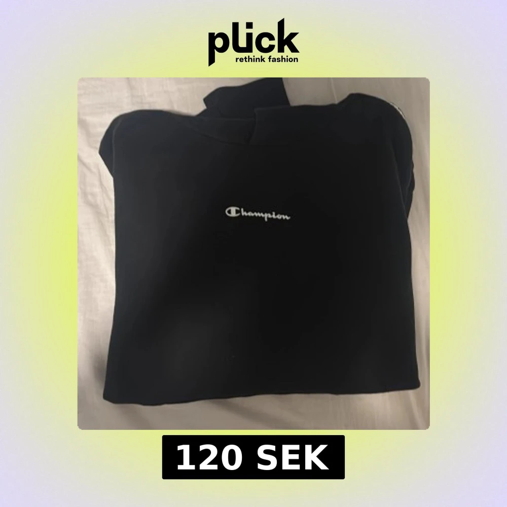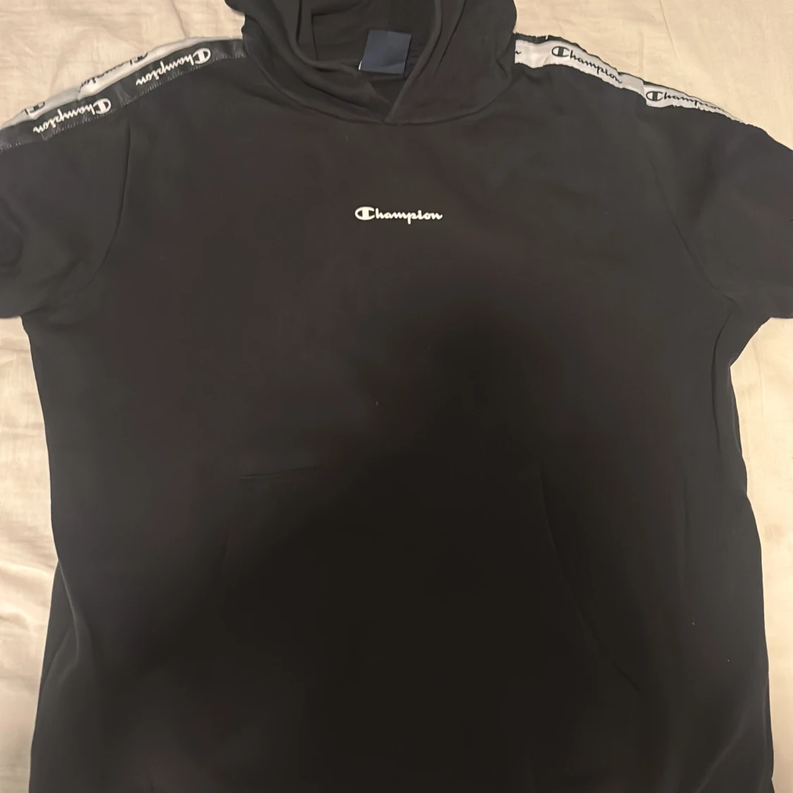 Svart hoodie från Champion med vit logga på bröstet och snygga band med Champion-tryck längs axlarna. Klassisk huva och stor magficka framtill. Perfekt för chill eller streetwear. Mjuk och skön i bomullsmix, normal passform och långärmad.