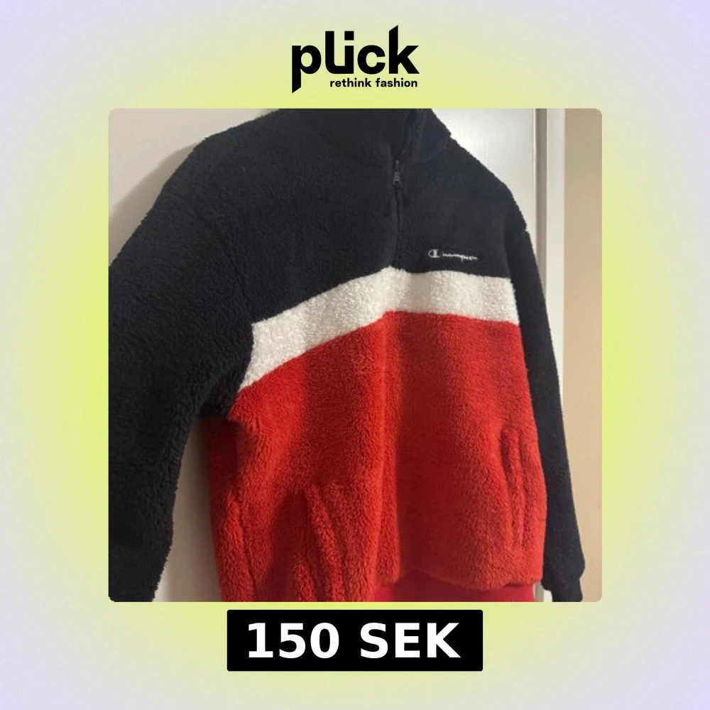 Säljer en mysig fleecejacka från Champion i svart, vitt och rött. Jackan har en dragkedja vid halsen och långa ärmar. Perfekt för kyliga dagar!