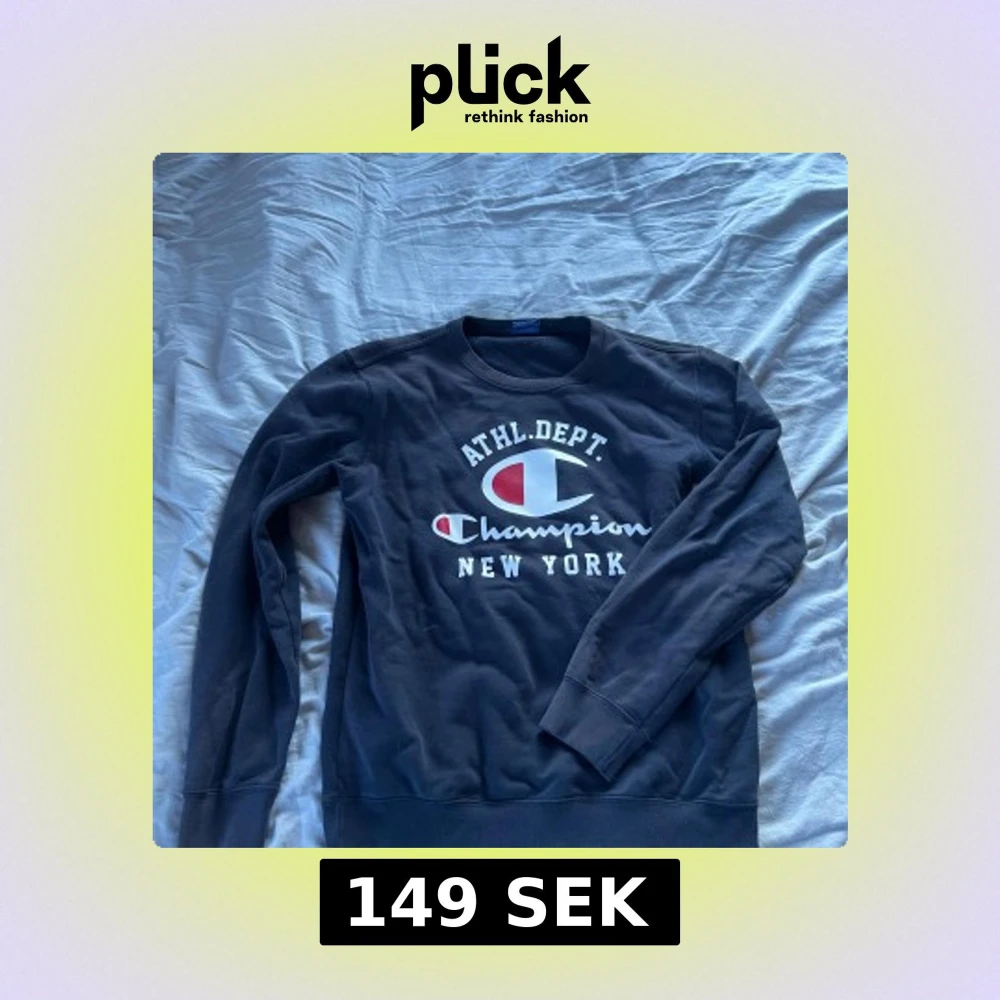 Svart sweatshirt från Champion med stort tryck på bröstet där det står ATHL. DEPT. och NEW YORK. Klassisk rund halsringning och långa ärmar. Perfekt för en sportig och avslappnad stil, storlek m.