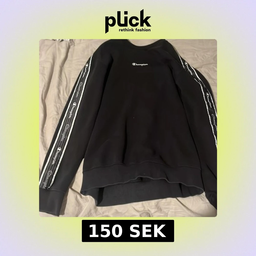 Svart sweatshirt från Champion i storlek S. Tröjan har vita loggor längs båda ärmarna och en liten broderad Champion-logga på bröstet. Klassisk passform med rund hals och långa ärmar. Perfekt för en sportig och avslappnad stil.