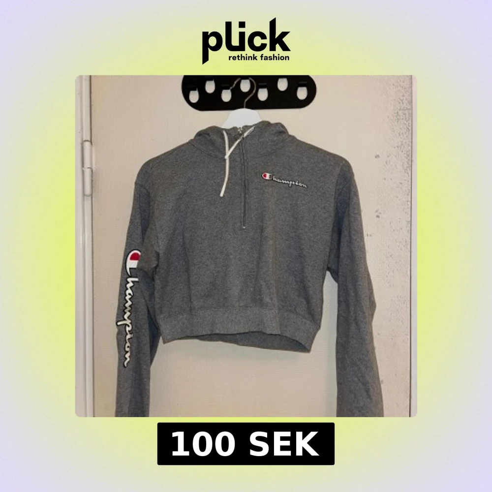 Säljer en grå croppad hoodie från Champion med dragkedja och justerbar huva. Den har Champion-loggan på bröstet och ärmen. Perfekt för en avslappnad stil eller till träningen.
