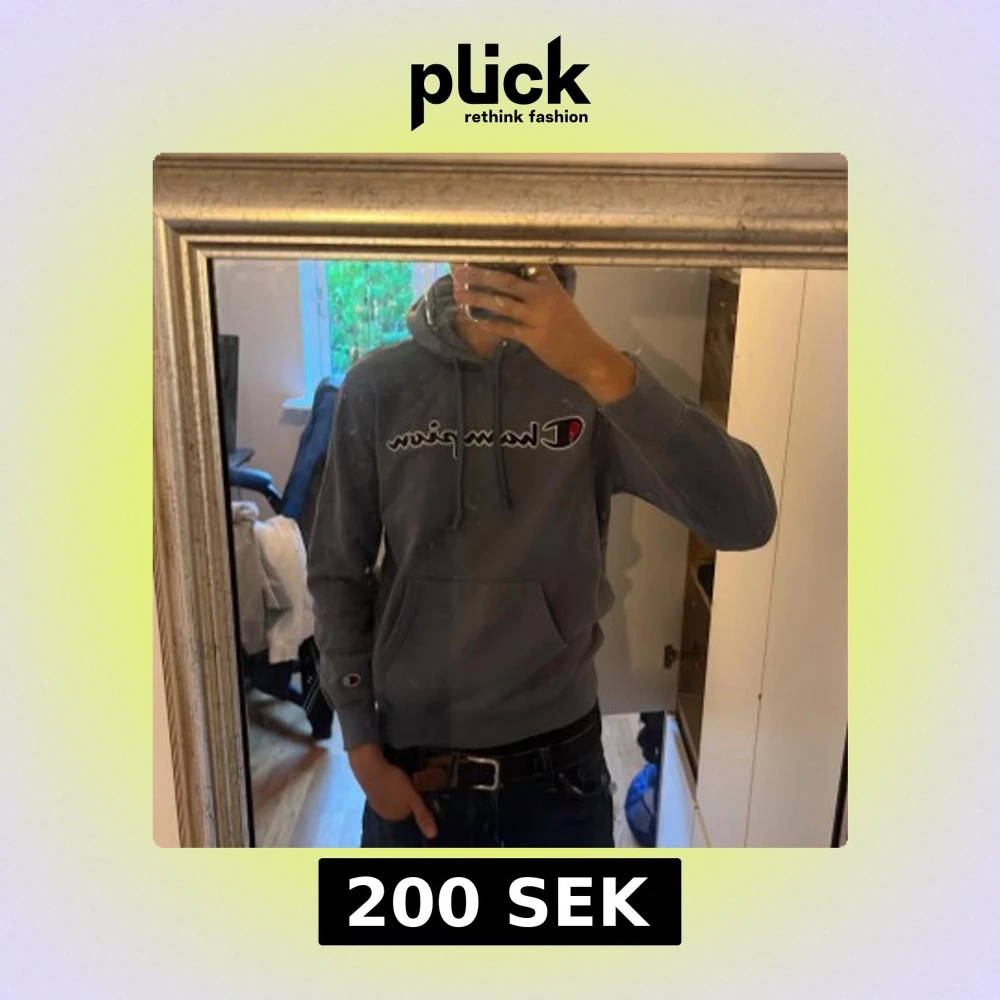 Säljer en grå hoodie från Champion i storlek small. Tröjan har stor broderad Champion-logga på bröstet, snörning i huvan och en klassisk känguruficka framtill. Mjuk insida och ribbade muddar vid ärmslut och nederkant.