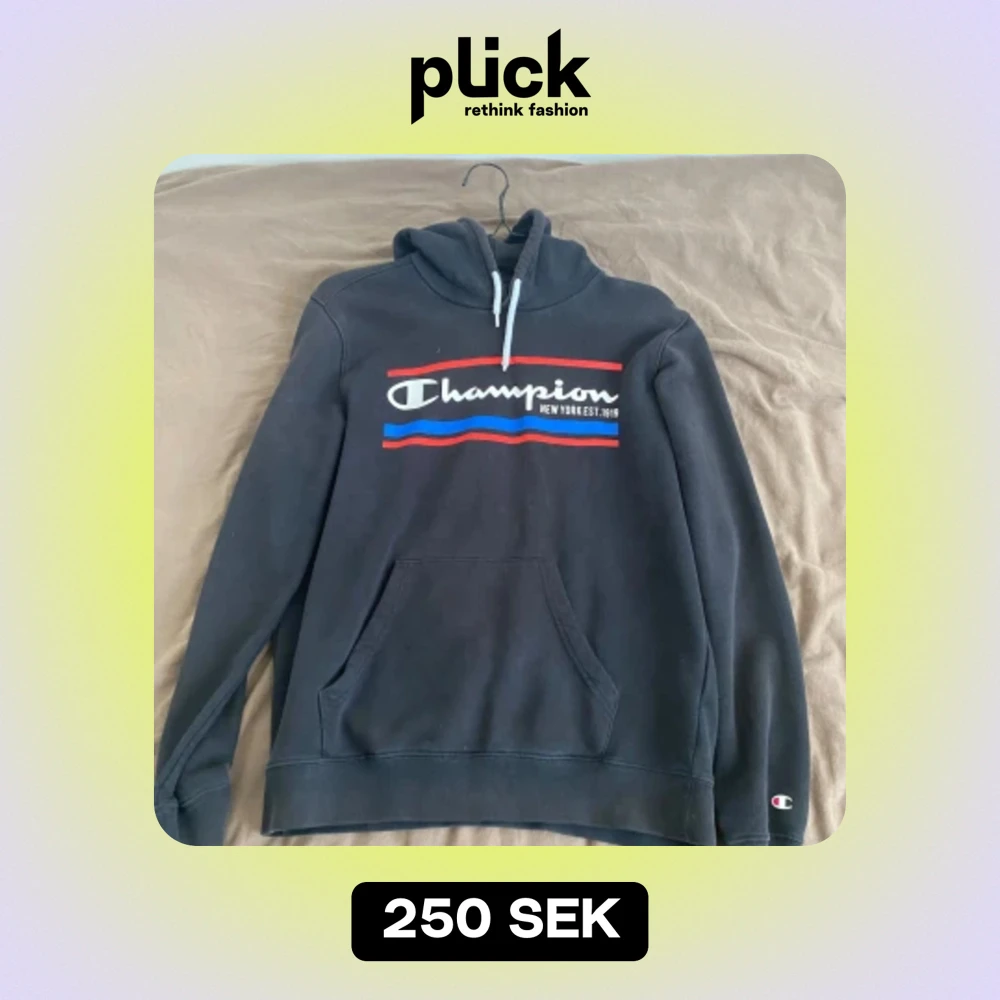 Säljer en svart hoodie från Champion med deras ikoniska logga i vitt, rött och blått på bröstet. Den har en känguruficka och justerbar huva med vita snören. Perfekt för en avslappnad stil eller träning.
