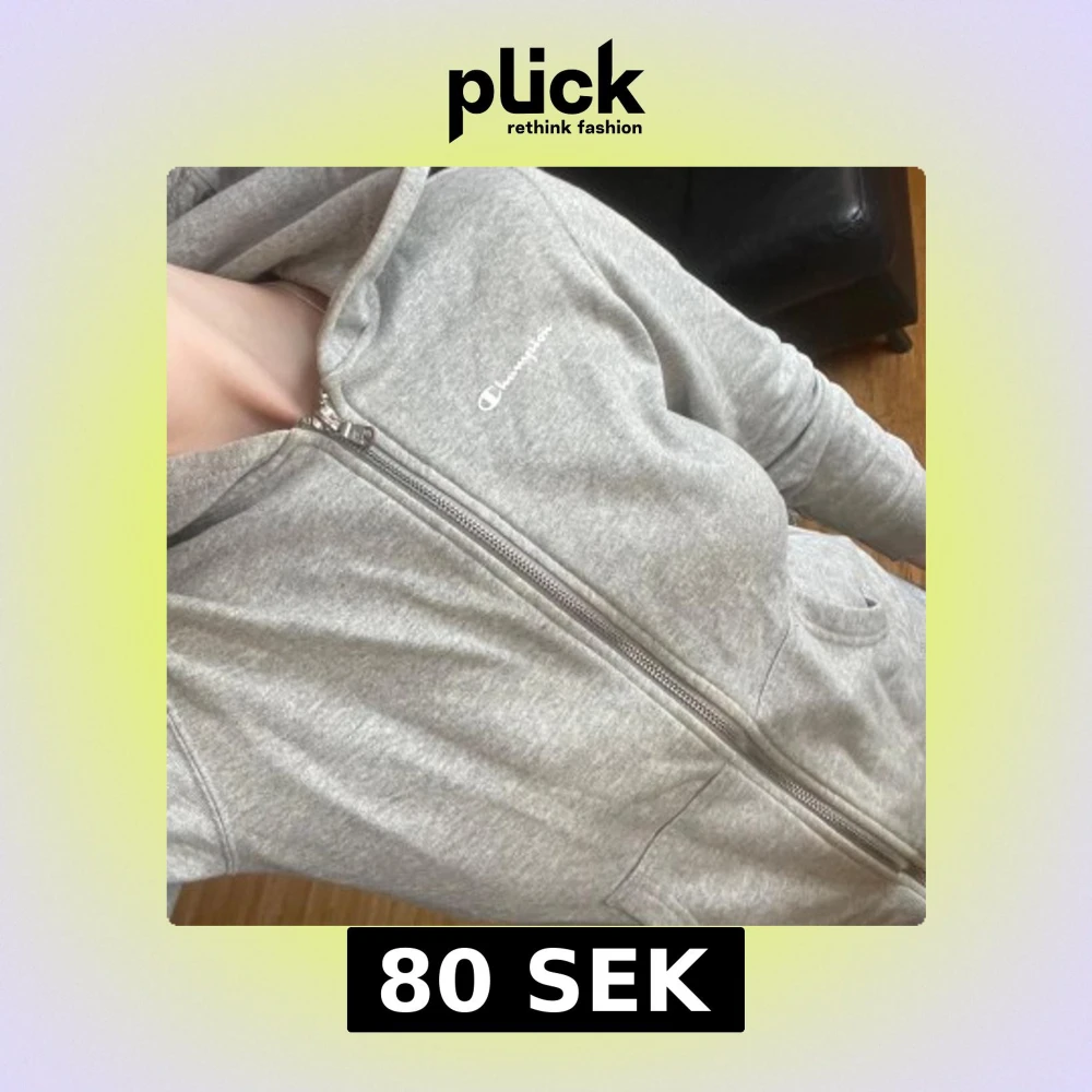 Säljer en klassisk grå hoodie med dragkedja från Champion. Tröjan har huva, fickor framtill och logga på bröstet.💕