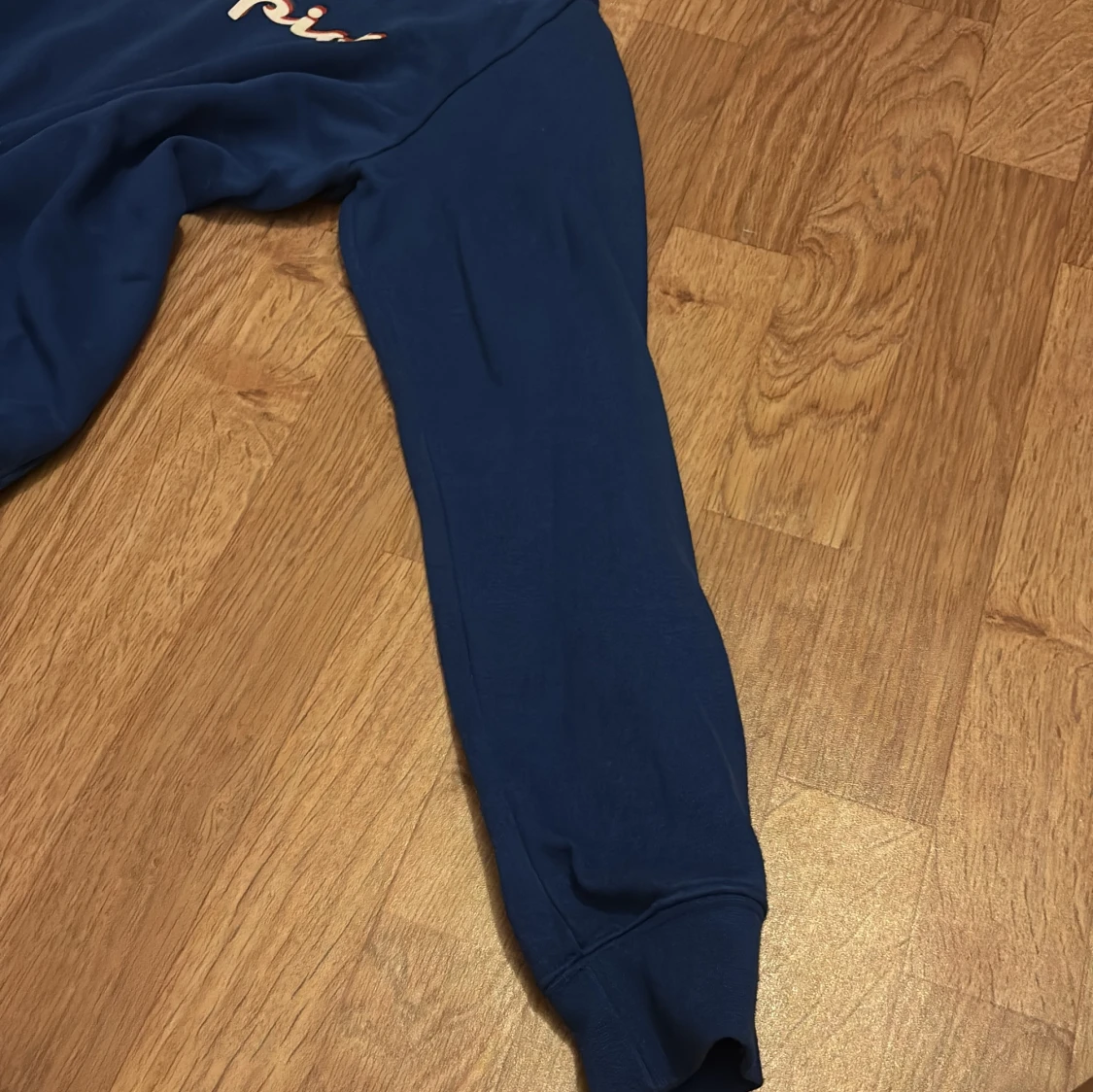 Säljer en blå sweatshirt från Champion med logga i vitt och rött på bröstet. Tröjan har rund hals och långa ärmar, perfekt för en avslappnad stil. Passar både tjejer och killar som gillar streetwear.