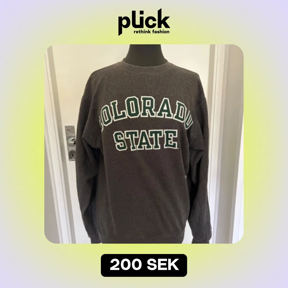 Säljer en mörkgrå sweatshirt från Champion med tryck i vitt och grönt på framsidan. Tröjan är perfekt för skolan eller bara en chill outfit