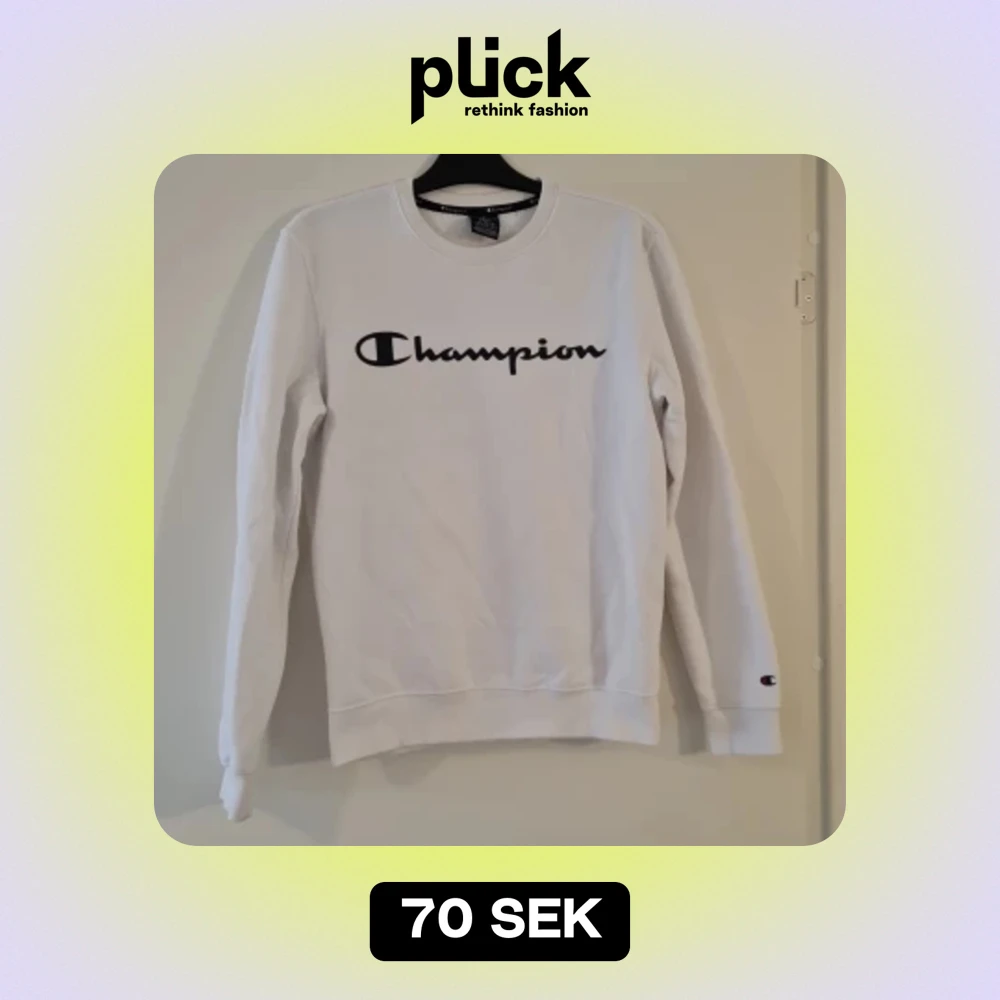 Vit Champion sweatshirt, knappt använd men har en fläck på baksidan (Se bild 3) Storlek: S
