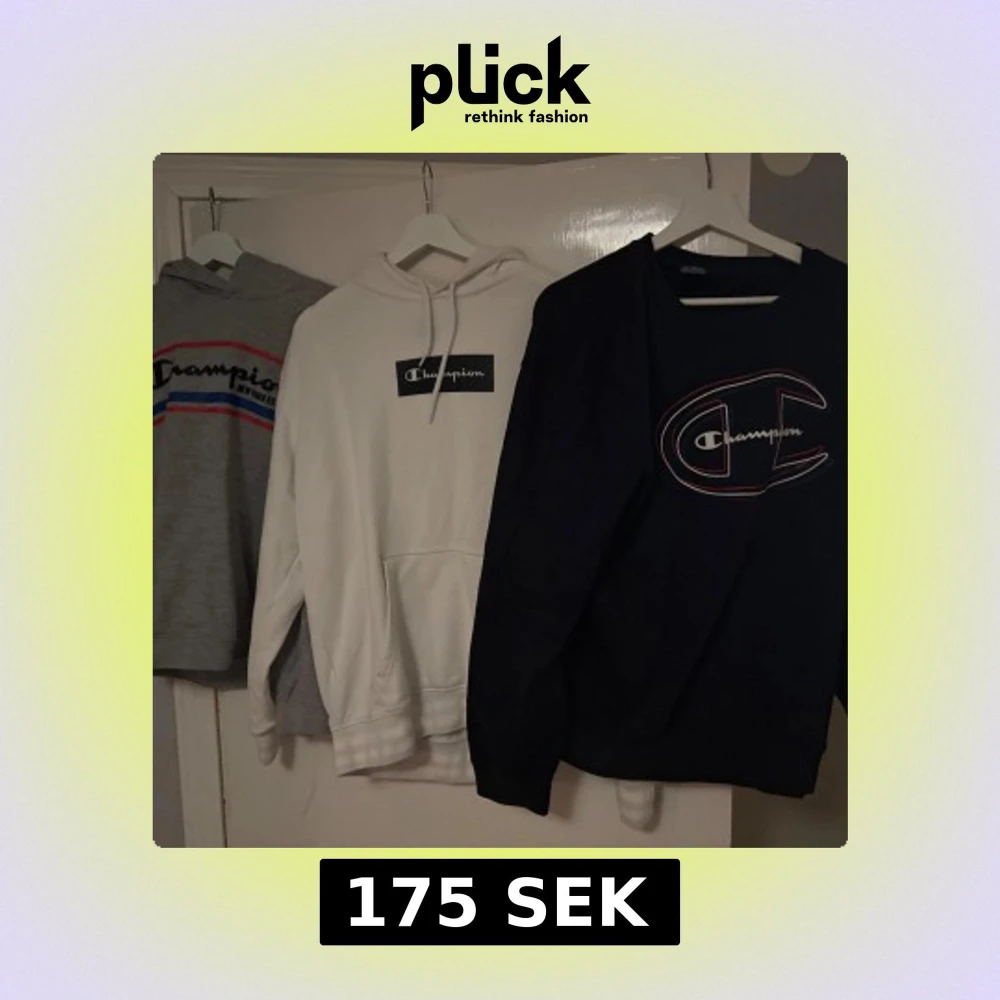 Tre snygga hoodies från Champion i grått, vitt och mörkblått. De har långa ärmar och klassisk Champion-logga på bröstet. Perfekta för en avslappnad stil. Bra kvalitet! Paketpris går att lösa