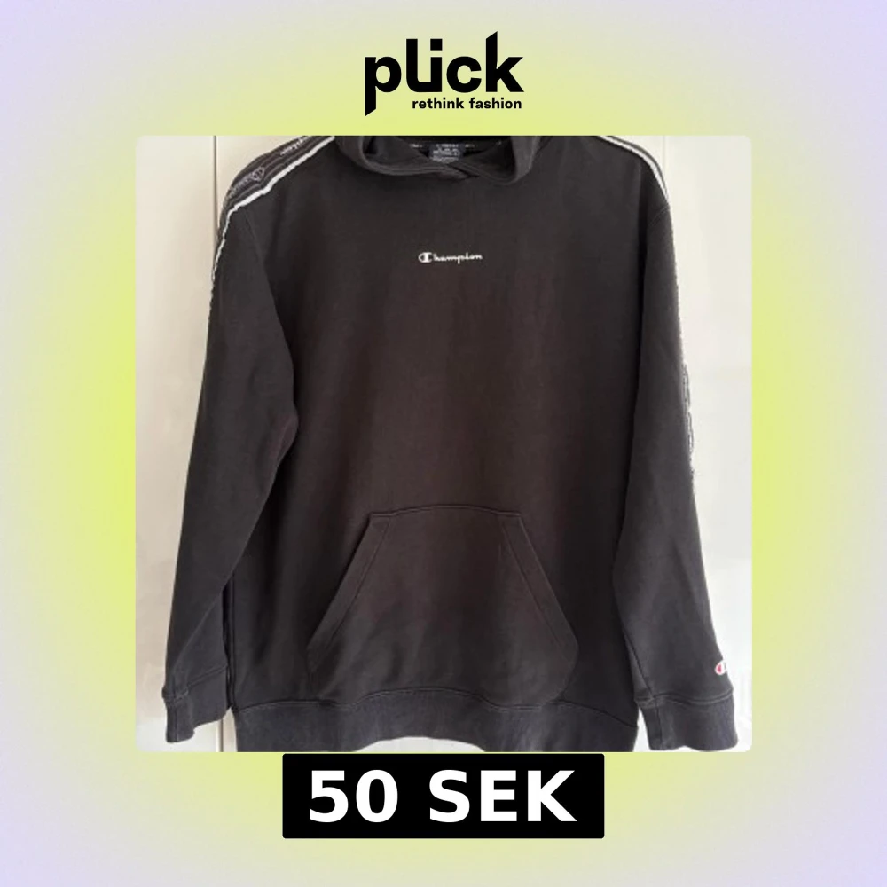 Svart hoodie från Champion i storlek XS. Lite oversized i modellen, så den är lite stor för xs. Klassisk modell med huva, magficka och broderad Champion-logga på bröstet. Broderat band med logga längs axlarna.