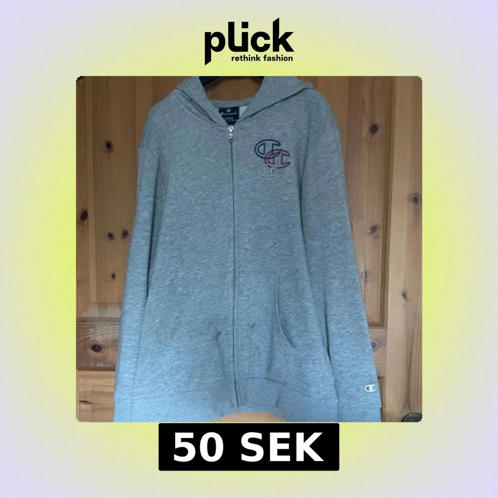 Säljer en grå hoodie från Champion med dragkedja och broderad logga på bröstet. Tröjan har långa ärmar och en bekväm passform. Perfekt för en avslappnad stil.