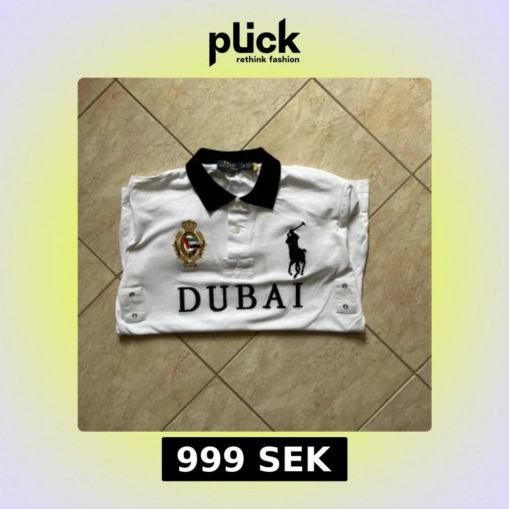 Vit pikétröja från Polo Ralph Lauren med svart krage och detaljer. Broderad Dubai-text, emblem och stor polospelare på bröstet. Siffran 2 på ryggen och ärmarna. Klassisk passform och korta ärmar, perfekt för en clean och sportig look. Använd ett fåtal gånger. Pris kan diskuteras vid snabbaffär. Hör av er vid intresse!
