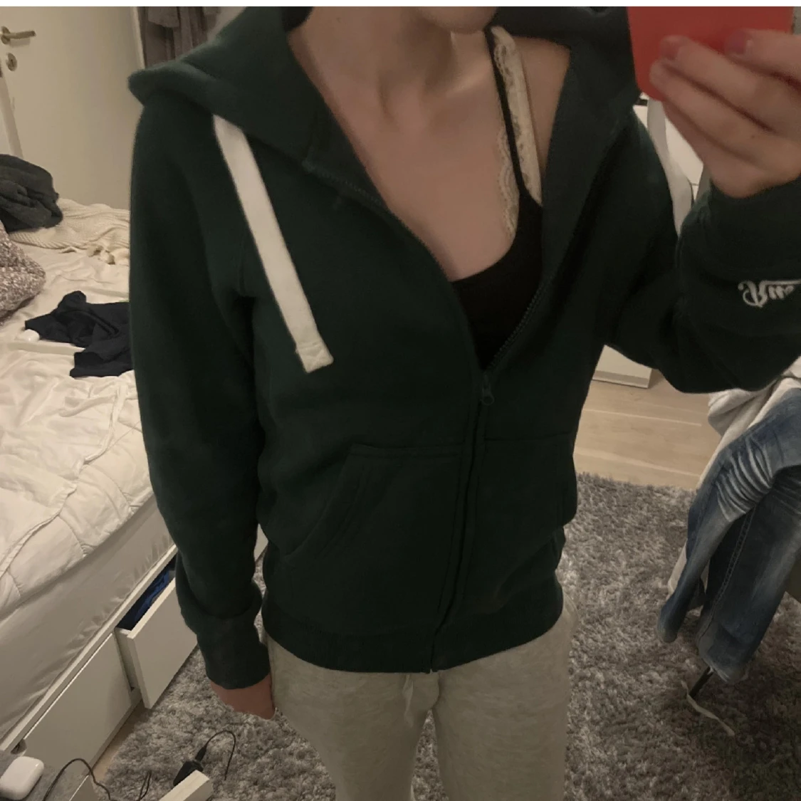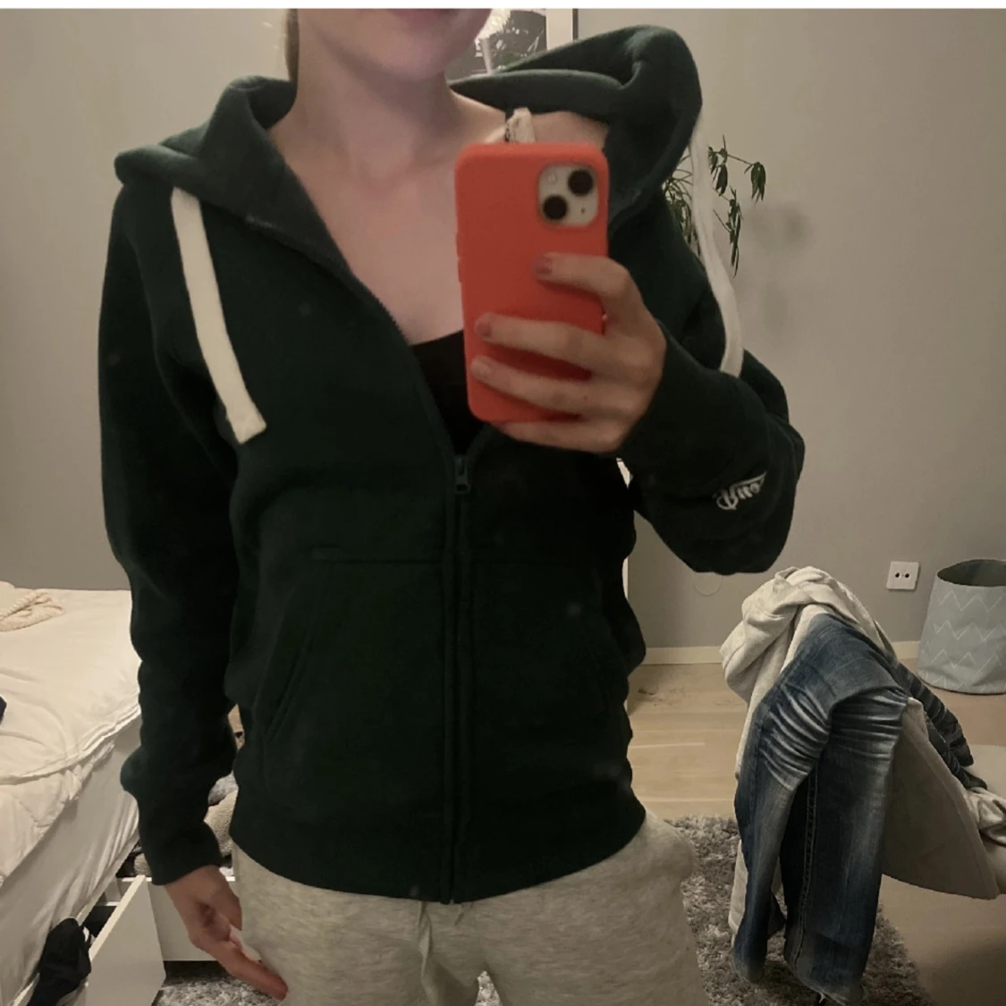 Mörkgrön hoodie med vit snörning och dragkedja framtill. Tröjan har huva, ribbade muddar och fickor på magen. Perfekt för chill dagar och enkel att matcha med jeans eller mjukisbyxor. Strlk S men passar typ som M också