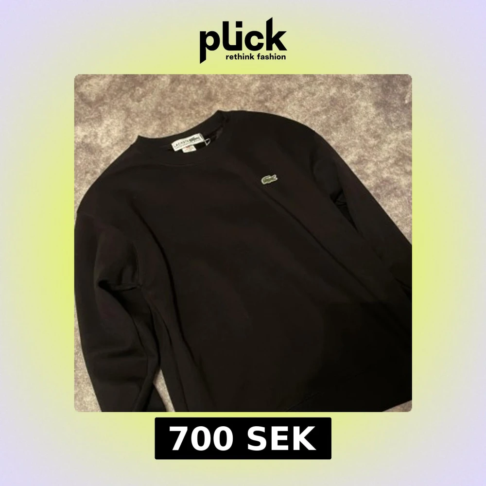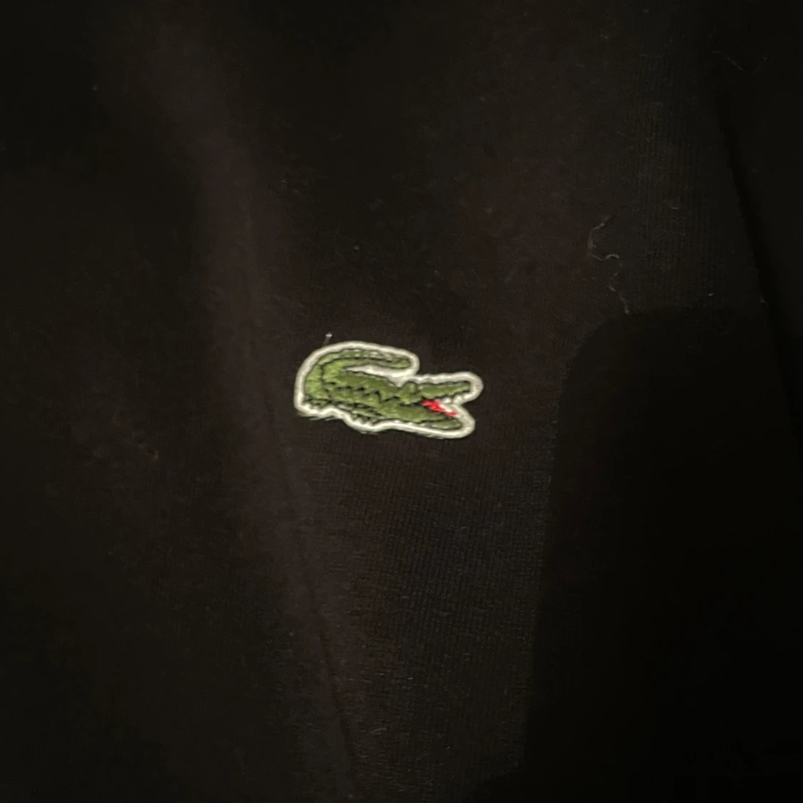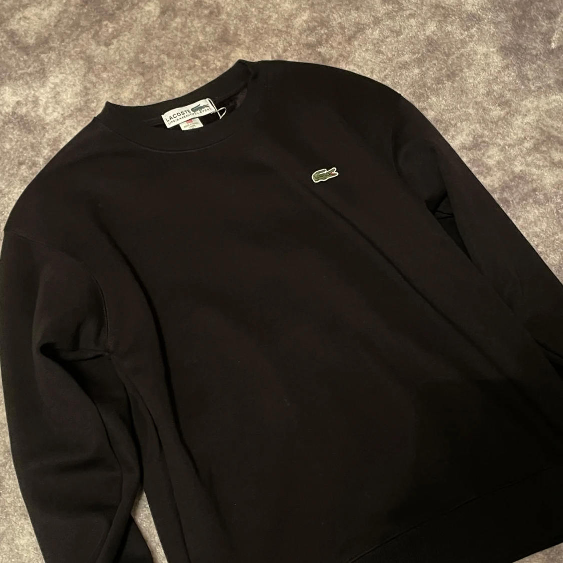 Säljer en stilren svart sweatshirt från Lacoste med det klassiska gröna krokodilmärket på bröstet. Tröjan har långa ärmar och en rund halsringning, perfekt för en avslappnad look. Storlek M, aldrig använd!!