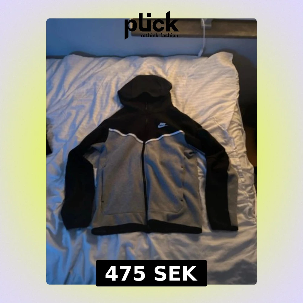 Nike hoodie i svart och grått med vit logga på bröstet. Tröjan har hel dragkedja, huva och två fickor framtill. Snygg design med kontrast mellan svart överdel och grå underdel, samt en vit linje som detalj. Perfekt för chill eller träning.De är en S men passar också M
