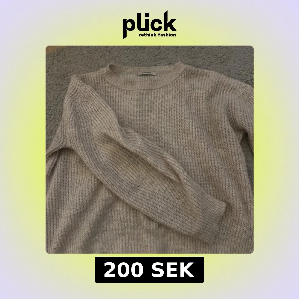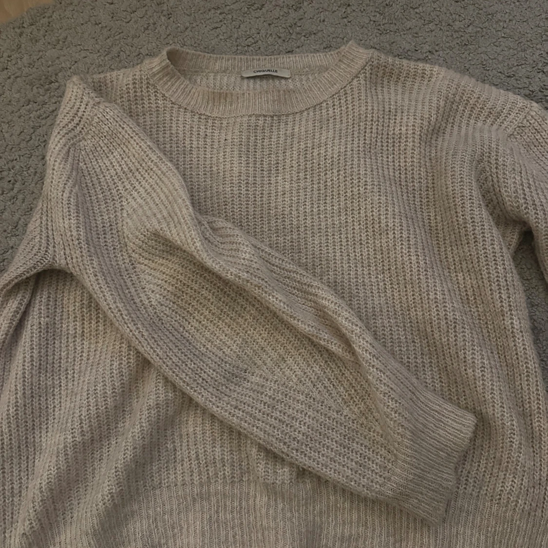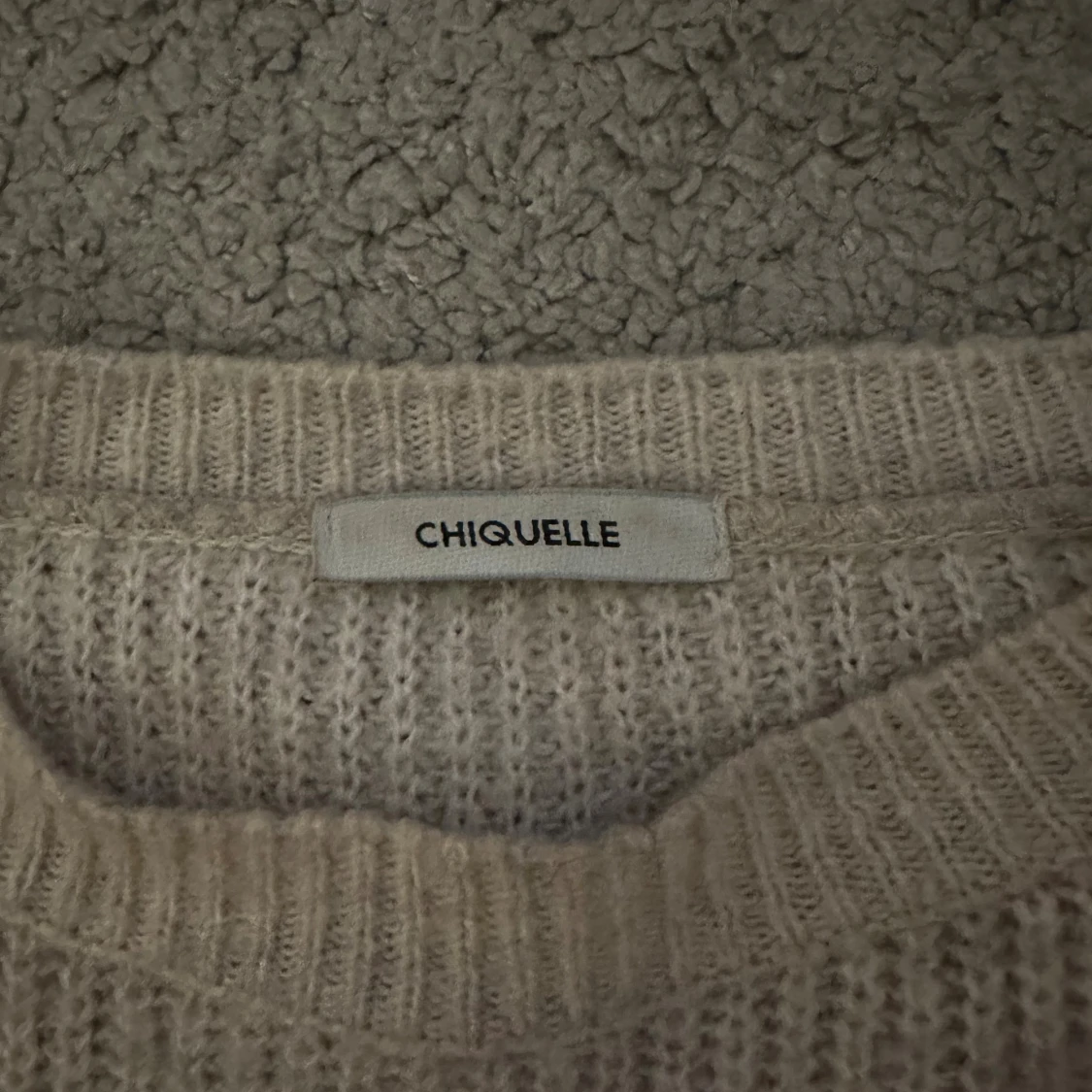 Mysig beige stickad tröja från Chiquelle med rund halsringning och långa ärmar. Storlek S, bra skick.