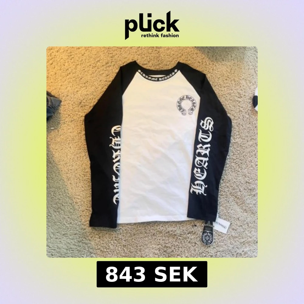 Säljer en långärmad tröja från Chrome Hearts med svartvita kontraster. Tröjan har svarta ärmar med stora vita tryck och vit framsida med Chrome Hearts-logga på bröstet och stort tryck på ryggen. Crewneck med tryckt text i halsen. Perfekt för dig som gillar streetwear.