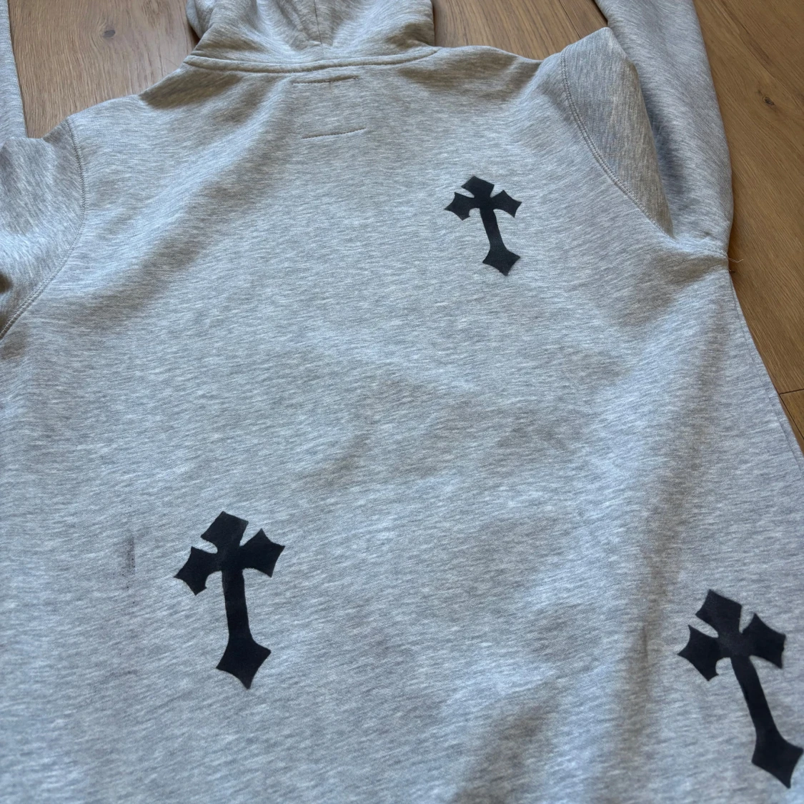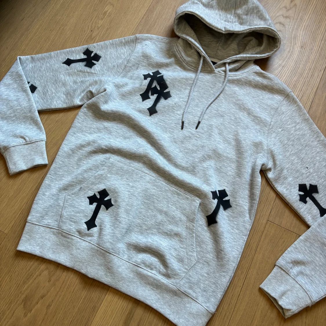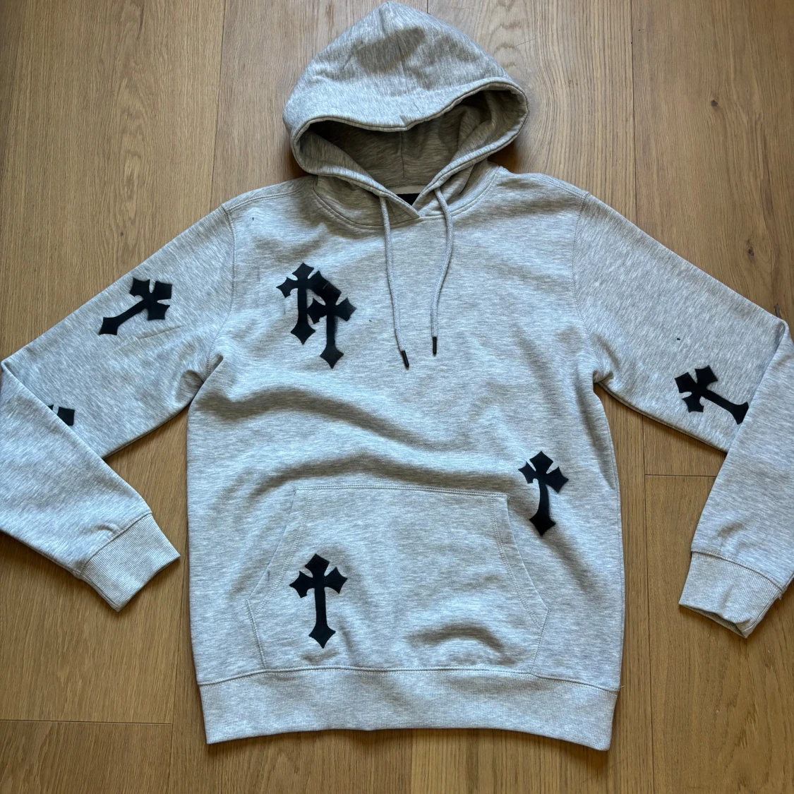 Säljer en stilren grå hoodie med svarta korsdetaljer. Tröjan har en klassisk huva med dragsko och en stor ficka framtill. Perfekt för en avslappnad stil.