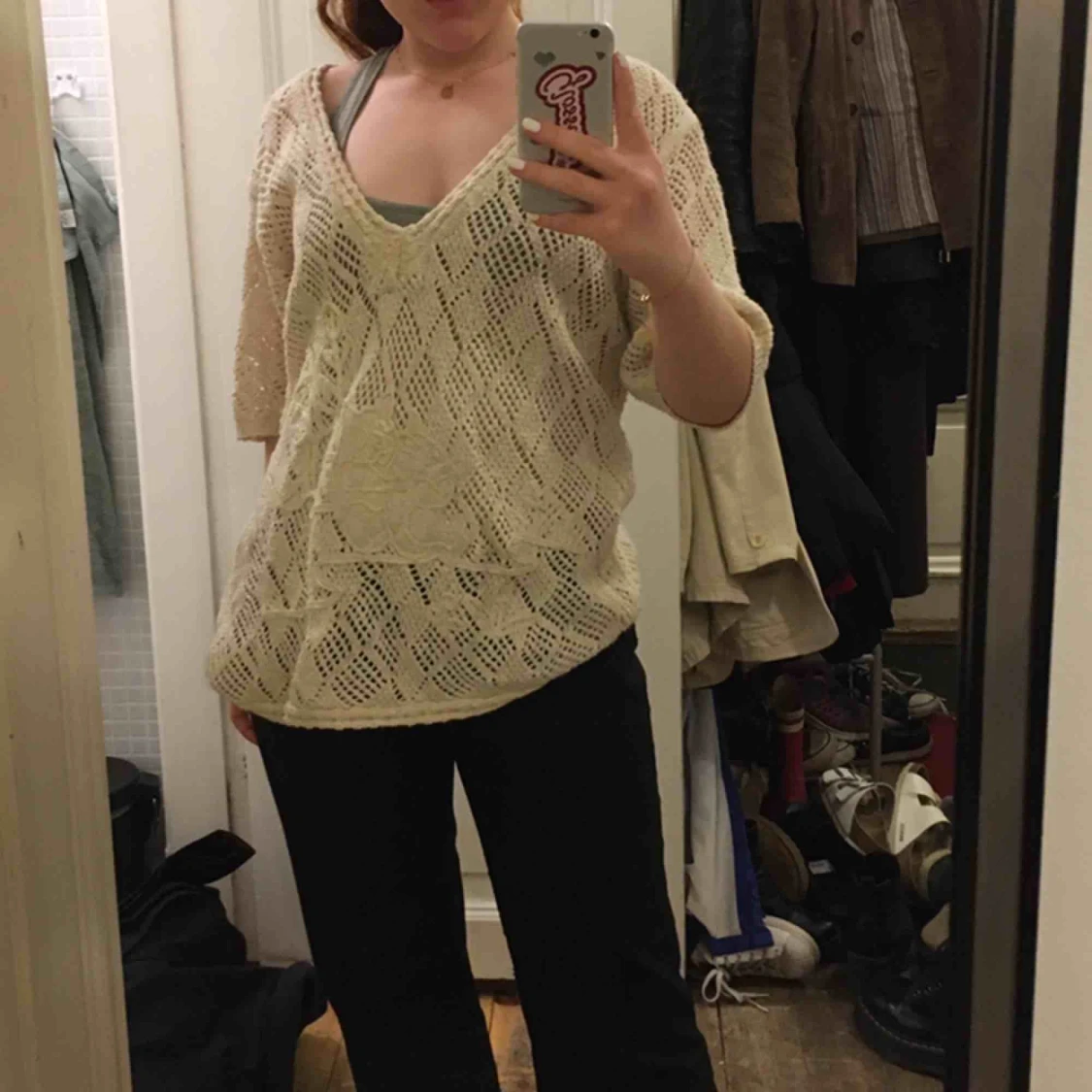 Virkad vit tröja. Oversized och ganska lång på mig som är 1.60m. Snygg till kjol och byxor! Bra skick. Möts i innerstan/köparen står för frakt.💖 Lite oklar storlek.
