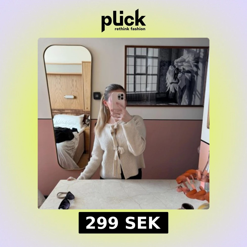 Superfin beige stickad kofta med två knyt framtill. Koftan har en mjuk och lite loose passform, långa ärmar och ribbad struktur. Perfekt att slänga över en topp för en chill och snygg look. Använd 1 gång, precis som ny. Passar både xs och s