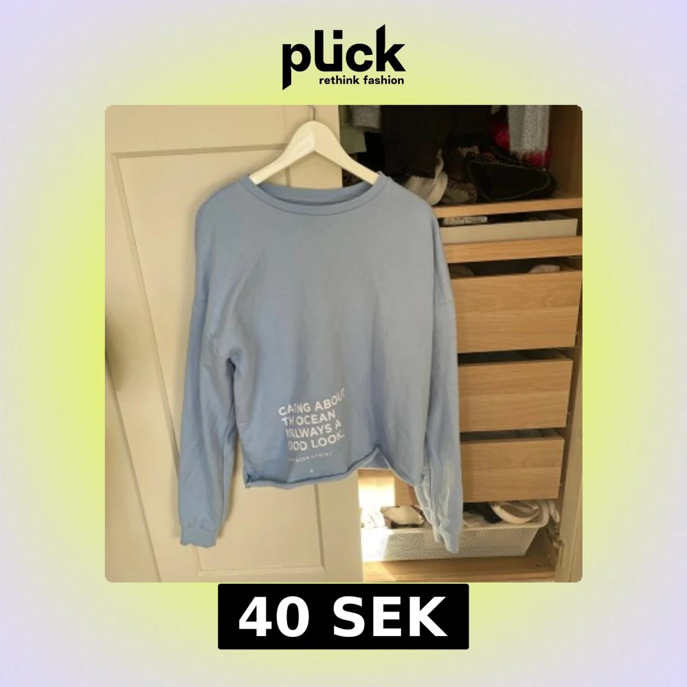 Ljusblå sweatshirt med vit text framtill: 'Caring about the ocean is always a good look.' Tröjan har rund hals, långa ärmar och ribbade muddar. Perfekt för en chill och avslappnad stil.