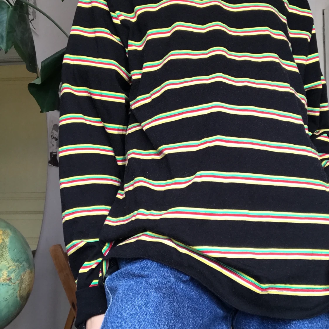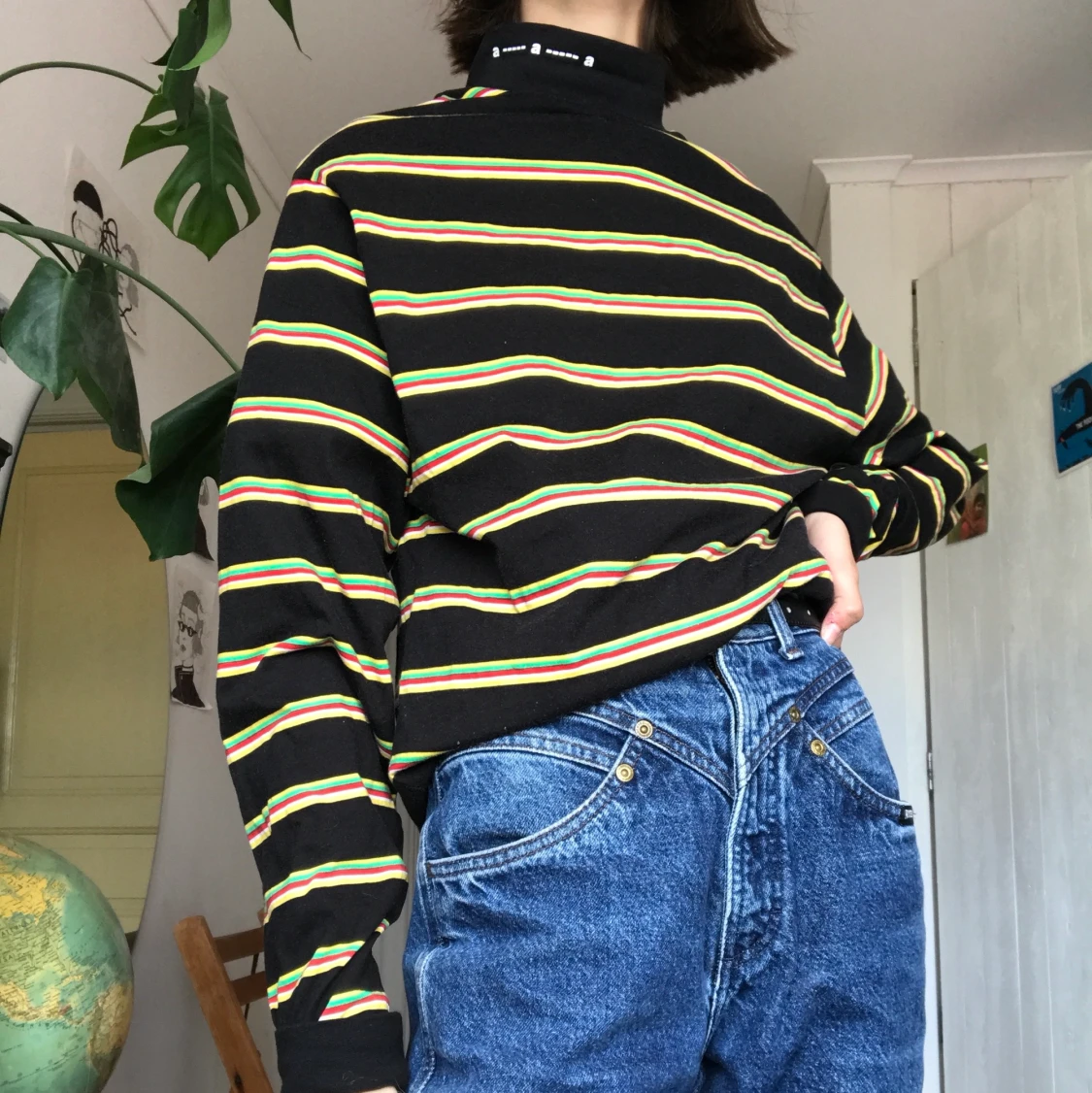Svart tröja med gula, röda, gröna och vita ränder och hög krage