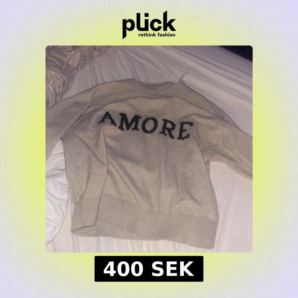 Beige stickad tröja från Gina Tricot med svart texten 'AMORE' framtill. Tröjan har rund halsringning, ribbade muddar och lång ärm. Perfekt för dig som gillar en enkel men ändå statement look. Storlek xs,s slutsåld