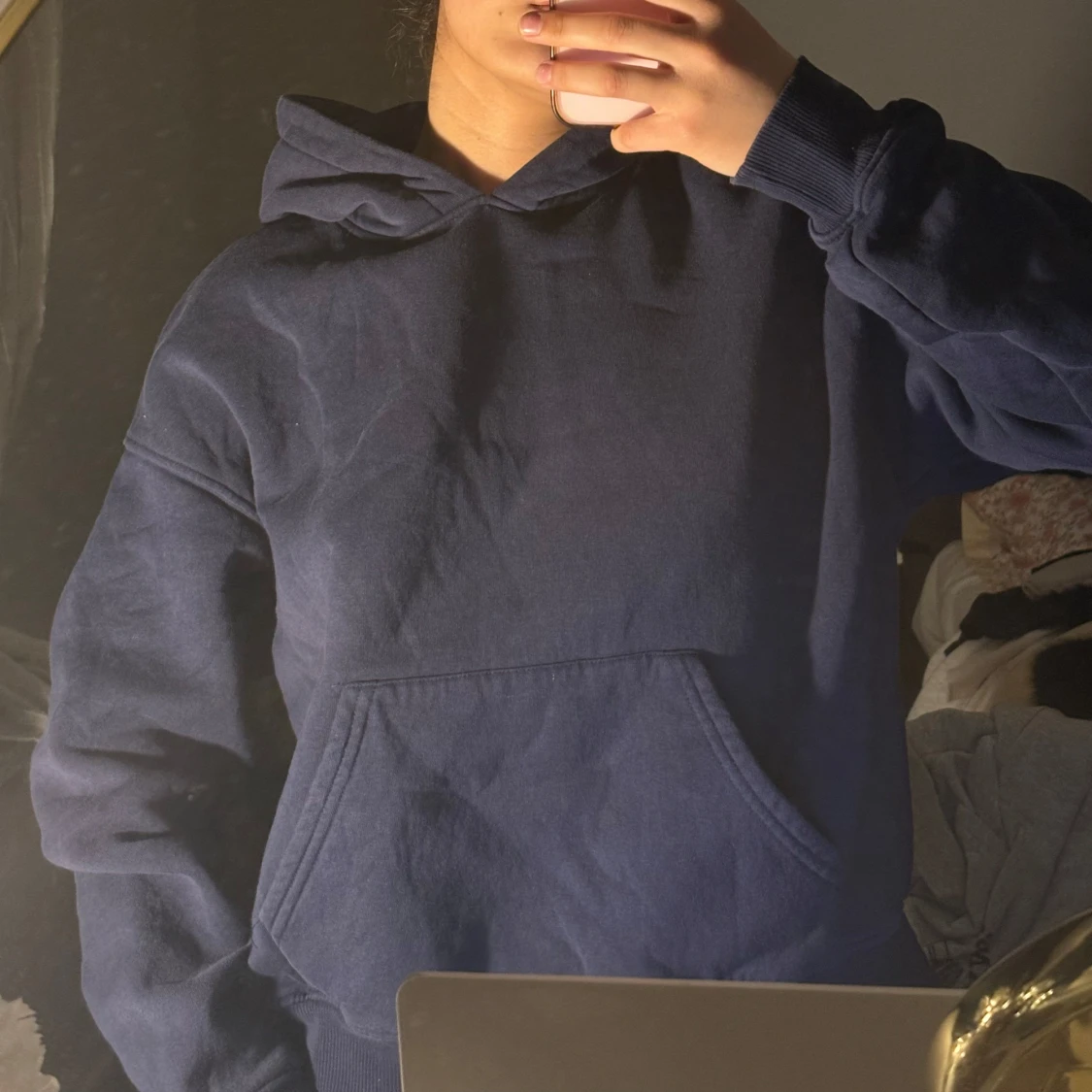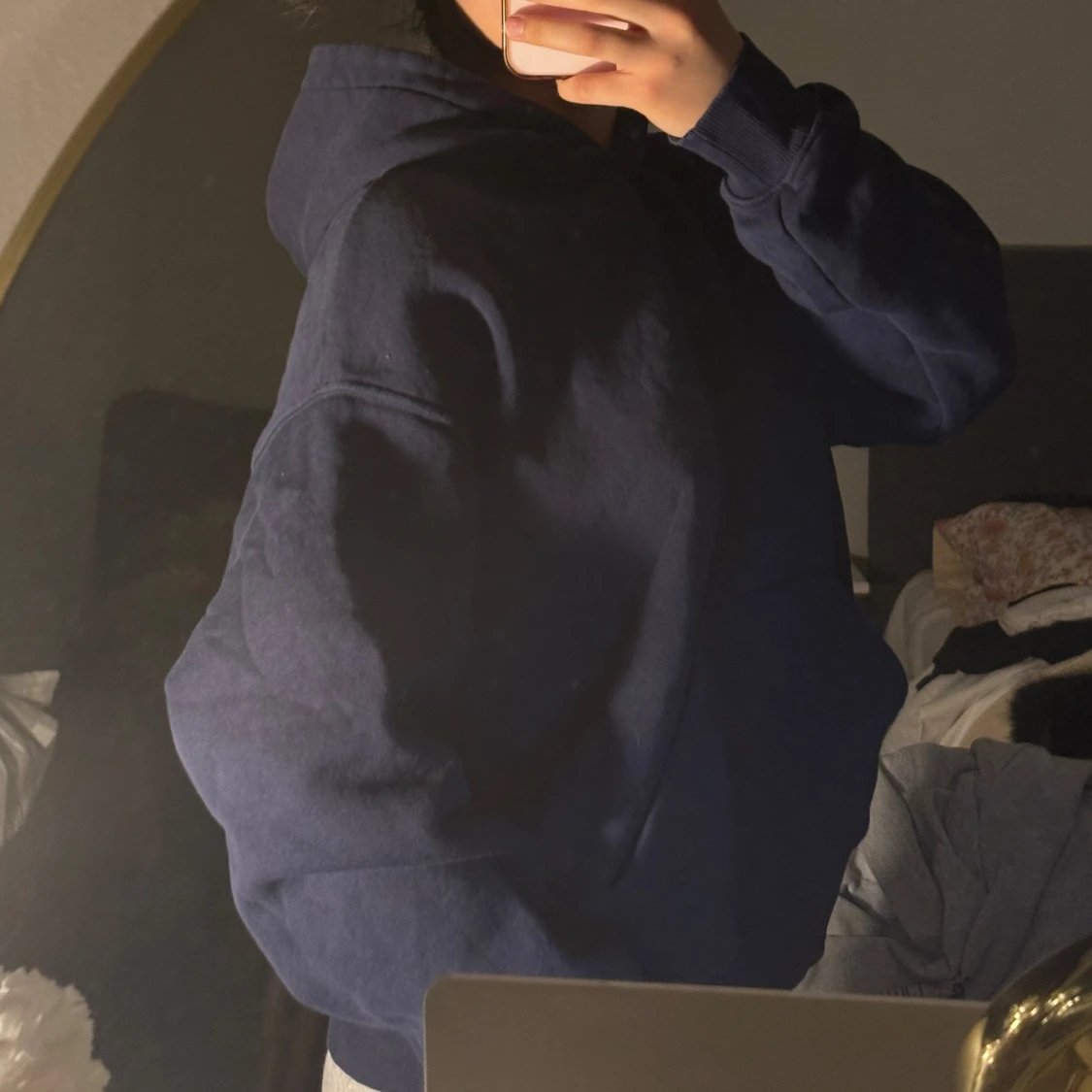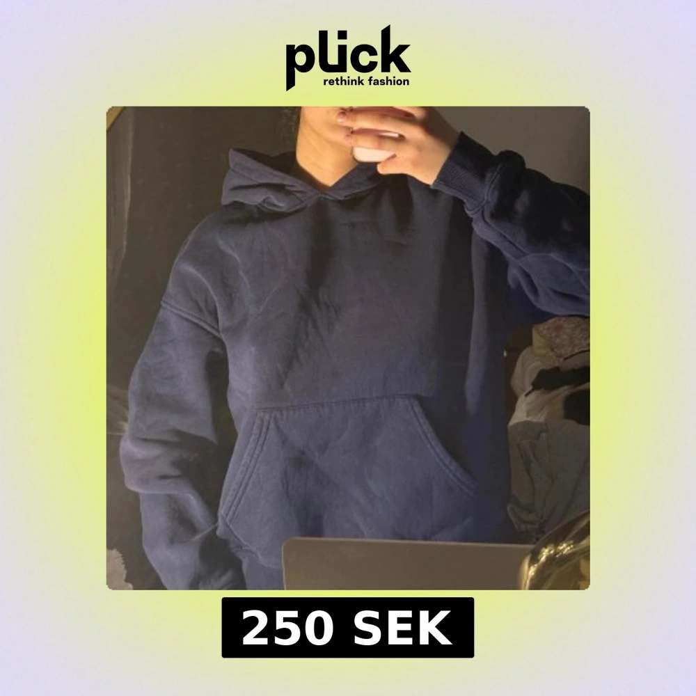 Säljer en enkel och stilren mörkblå hoodie med huva och stor magficka. Tröjan har långa ärmar och en avslappnad passform, perfekt för vardagsbruk eller när du vill vara extra bekväm.