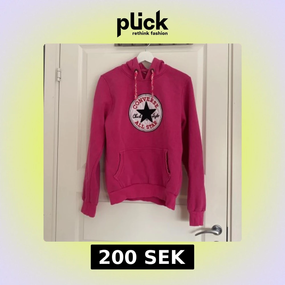Säljer en snygg rosa hoodie från Converse med stort broderat All Star-märke på bröstet. Tröjan har huva med snörning, magficka och långa ärmar. Perfekt för dig som gillar streetstyle och vill ha något bekvämt och färgglatt.