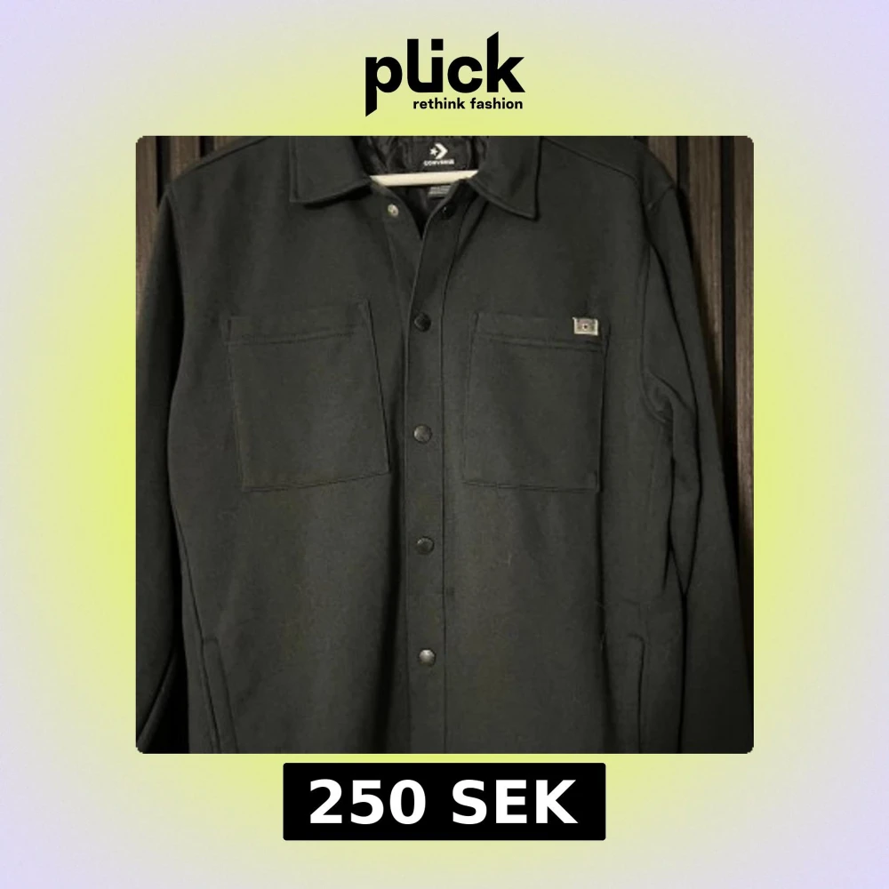 Stilren svart overshirt från Converse i storlek XLi barn strl alltså 168-175. Skjortan har två stora bröstfickor, tryckknappar framtill och klassisk krage. Materialet är mjukt och känns som ullmix, perfekt för lager-på-lager. Diskret Converse All Star-märke på ena fickan. Riktigt g0